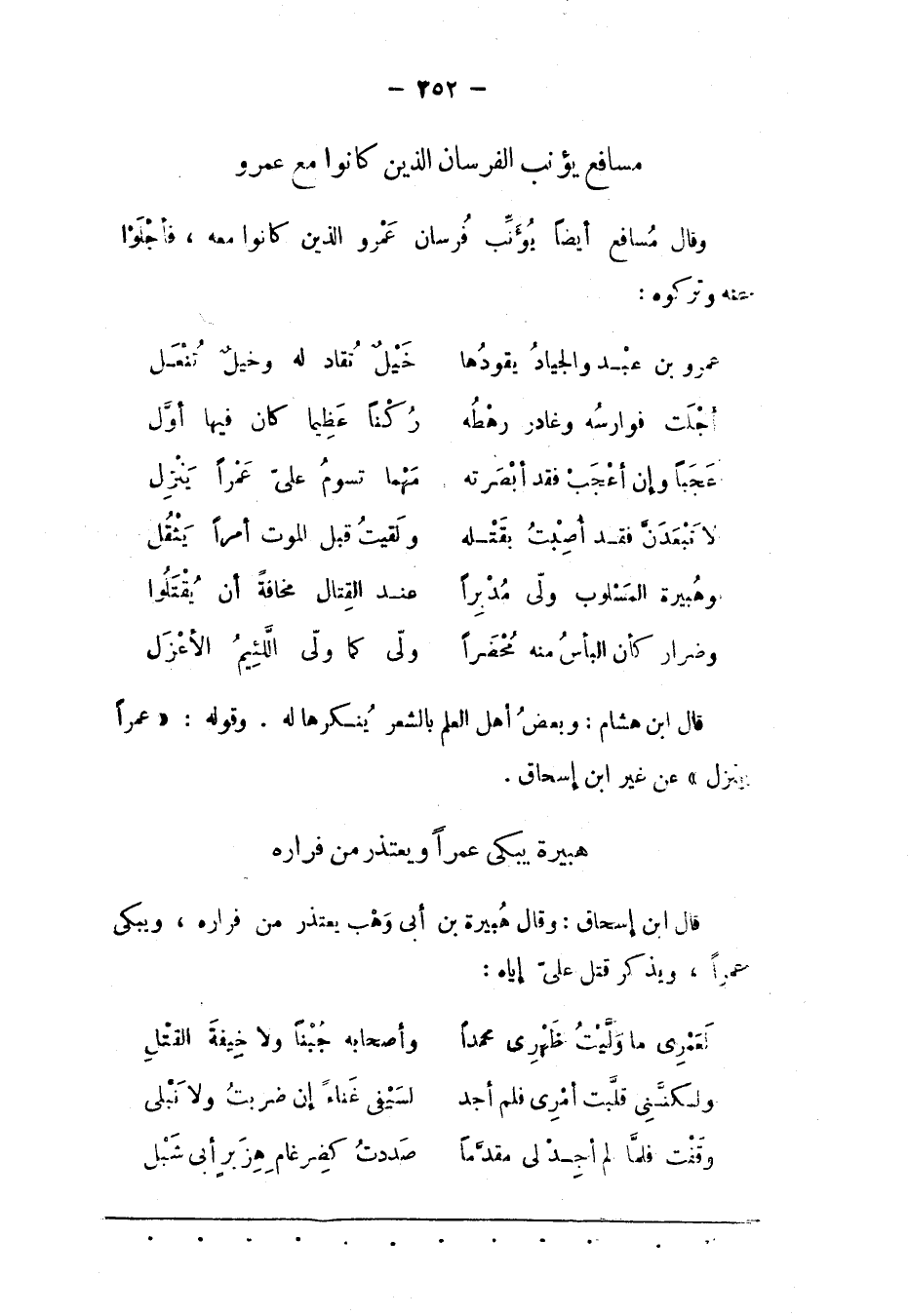 هبيرة يبكى عمرا ويعتذر مِنْ فِرَارِهِ قَالَ ابْنُ إسْحَاقَ: وَقَالَ هُبَيْرَةُ بْنُ أَبِي وَهْبٍ يَعْتَذِرُ مِنْ فِرَارِهِ، وَيَبْكِي عمرا، ويذكر قتل علىّ إياه: