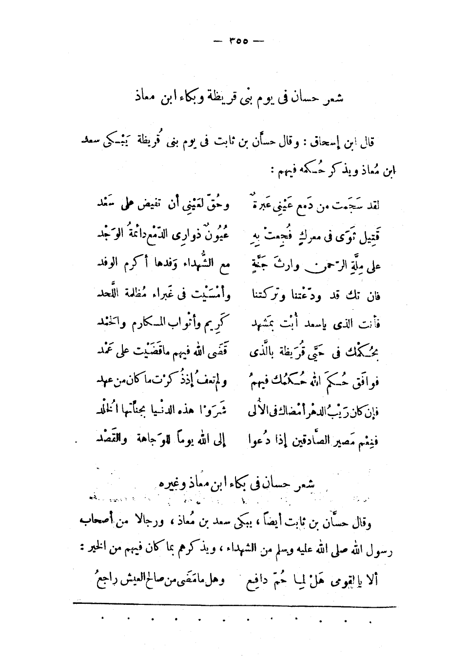 شِعْرُ حَسّانَ فِي بُكَاءِ ابْنِ مُعَاذٍ وَغَيْرِهِ وَقَالَ حَسّانُ بْنُ ثَابِتٍ أَيْضًا، يَبْكِي سَعْدَ بْنَ مُعَاذٍ، وَرِجَالًا مِنْ أَصْحَابِ رَسُولِ اللهِ صَلَّى اللَّهُ عَلَيْهِ وَسَلّمَ مِنْ الشّهَدَاءِ، وَيَذْكُرُهُمْ بِمَا كَانَ فِيهِمْ مِنْ الْخَيْرِ: