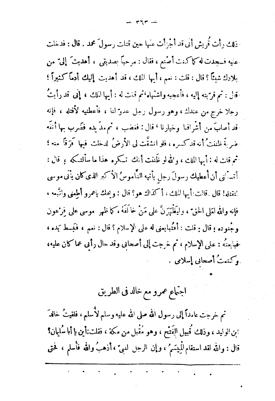 أَتَسْأَلُنِي أَنْ أُعْطِيَك رَسُولَ رَجُلٍ يَأْتِيهِ النّامُوسُ الْأَكْبَرُ الّذِي كان يأتى موسى لتقتله! قال: قالت: أَيّهَا الْمَلِكُ، أَكَذَاك هُوَ؟ قَالَ: وَيْحَك يَا عَمْرُو أَطِعْنِي وَاتّبِعْهُ، فَإِنّهُ وَاَللهِ لَعَلَى الْحَقّ، وَلَيَظْهَرَنّ عَلَى مَنْ خَالَفَهُ، كَمَا ظَهَرَ مُوسَى عَلَى فِرْعَوْنَ وَجُنُودِهِ؛ قَالَ: قُلْت: أَفَتُبَايِعُنِي لَهُ عَلَى الْإِسْلَامِ؟ قَالَ: نَعَمْ، فَبَسَطَ يَدَهُ، فَبَايَعْتُهُ: عَلَى الْإِسْلَامِ، ثُمّ خَرَجْت إلَى أَصْحَابِي وَقَدْ حَالَ رَأْيِي عَمّا كَانَ عَلَيْهِ، وَكَتَمْتُ أَصْحَابِي إسلامى.