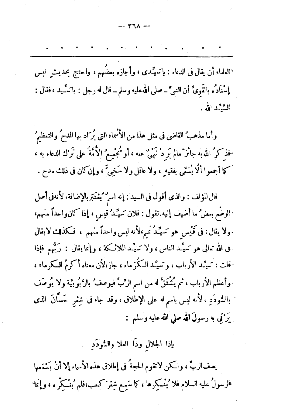 العلماء أن يقال فِي الدّعَاءِ: يَا سَيّدِي، وَأَجَازَهُ بَعْضُهُمْ، وَاحْتَجّ بِحَدِيثِ لَيْسَ إسْنَادُهُ بِالْقَوِيّ أَنّ النّبِيّ- صَلَّى اللَّهُ عَلَيْهِ وَسَلَّمَ- قَالَ لَهُ رَجُلٌ: يَا سَيّدُ، فَقَالَ: