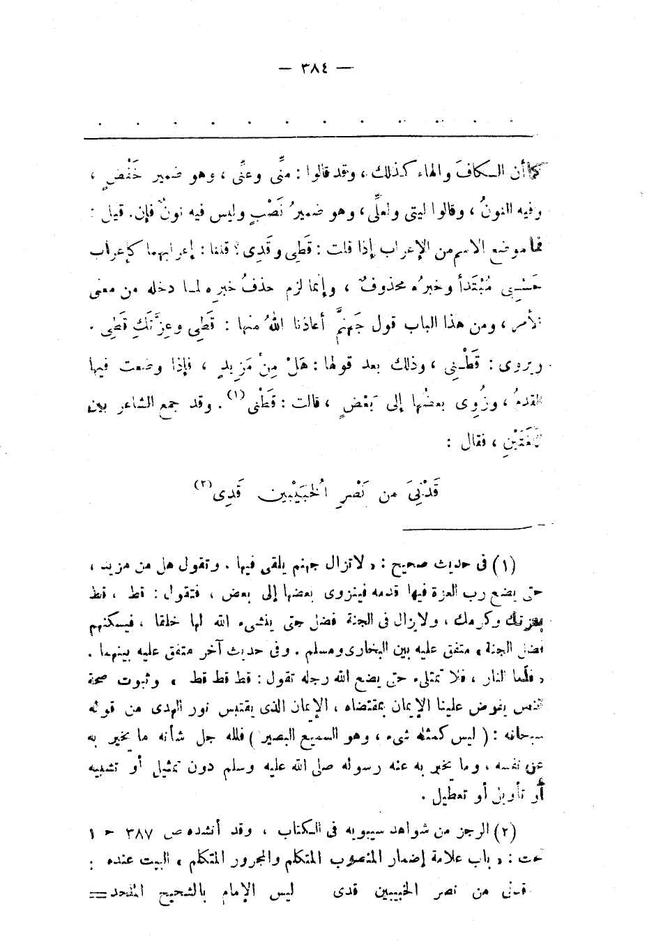 (1) فى حديث صحيح: «لا تزال جهنم يلقى فيها. وتقول هل من مزيد، حتى يضع رب العزة فيها قدمه فينزوى بعضها إلى بعض، فتقول: قط، قط بعزتك وكرمك، ولا يزال فى الجنة فضل حتى ينشىء الله لها خلقا، فيسكنهم فضل الجنة» متفق عليه بين البخارى ومسلم. وفى حديث آخر متفق عليه بينهما. «فأما النار، فلا تمتلىء حتى يضع الله رجله تقول: قط قط قط» وثبوت صحة النص يفرض علينا الإيمان بمقتضاه، الإيمان الذى يقتبس نور الهدى من قوله سبحانه: (لَيْسَ كَمِثْلِهِ شَيْءٌ، وَهُوَ السَّمِيعُ الْبَصِيرُ) فلله جل شأنه ما يخير به عن نفسه، وما يخبر به عنه رسوله صلى الله عليه وسلم دون تمثيل أو تشبيه أو تأويل أو تعطيل.