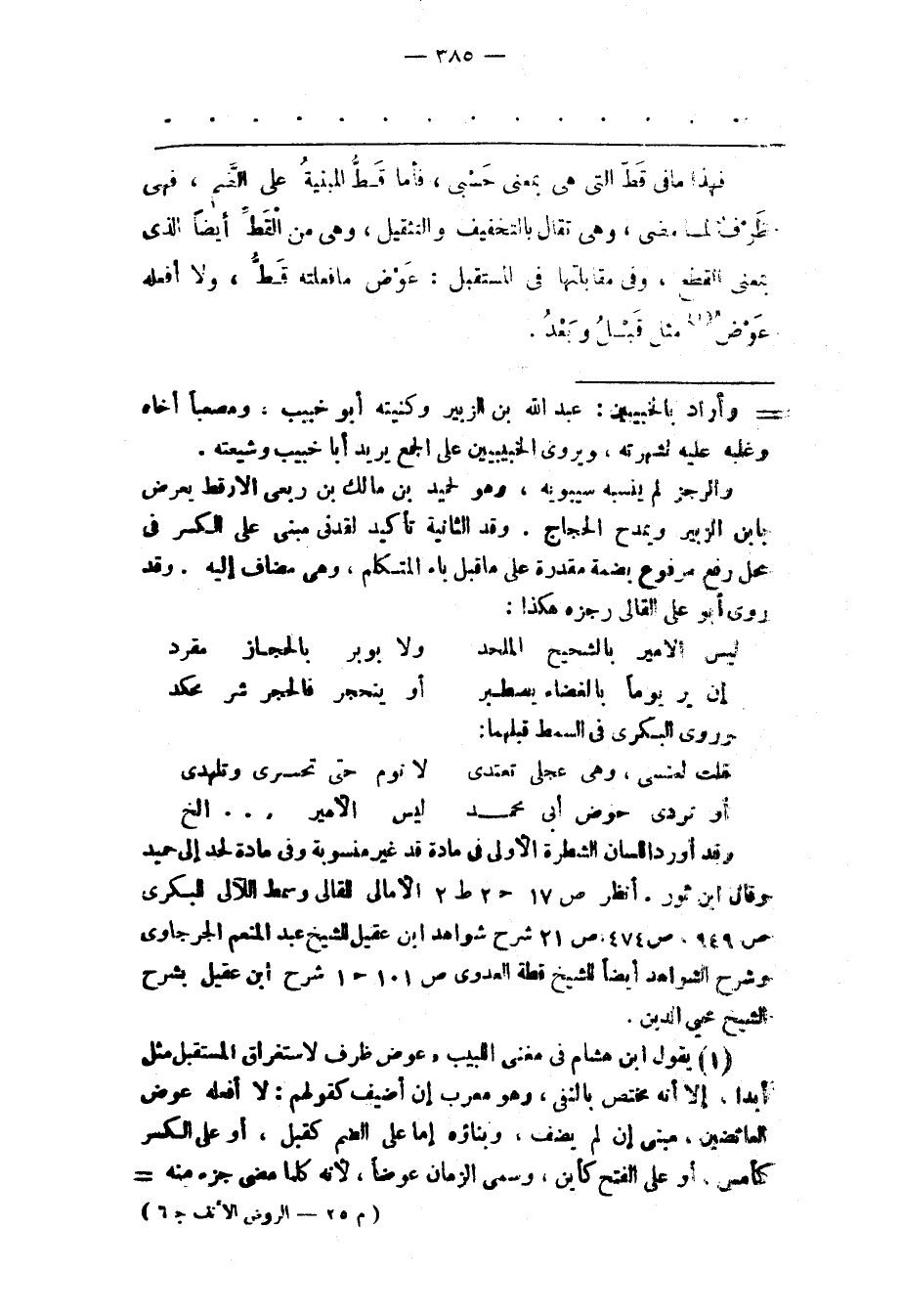 (1) يقول ابن هشام فى مغنى اللبيب «عوض ظرف لاستغراق المستقبل مثل أبدا، إلا أنه مختص بالنفى، وهو معرب إن أضيف كقولهم: لا أفعله عوض العائضين، مبنى إن لم يضف، وبناؤه إما على الضم كقبل، أو على الكسر كأمس، أو على الفتح كأين، وسمى الزمان عوضا، لأنه كلما مضى جزء منه-