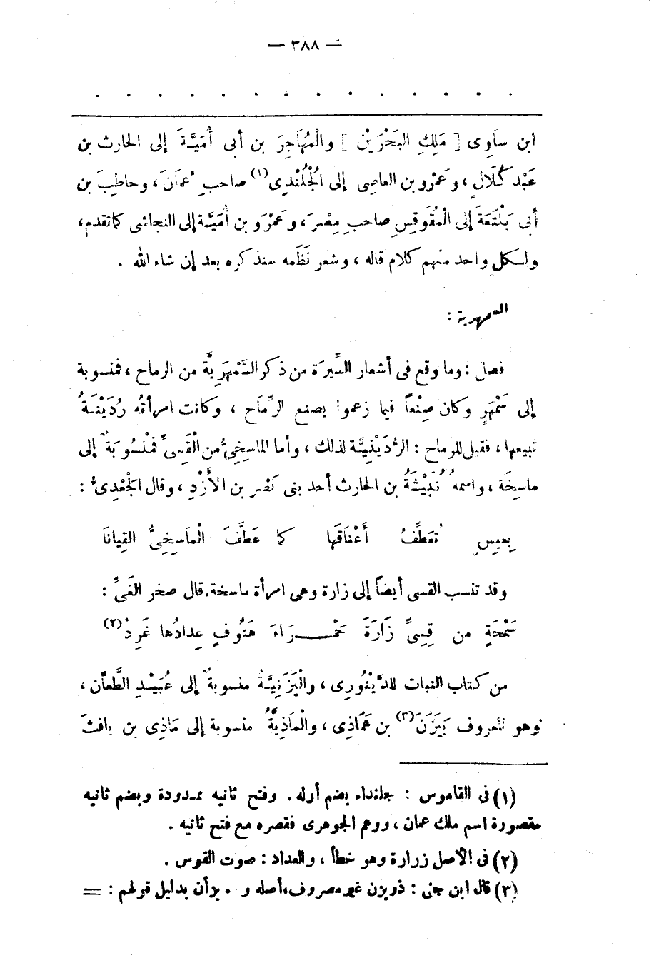 فَصْلٌ: وَمَا وَقَعَ فِي أَشْعَارِ السّيرَةِ مِنْ ذِكْرِ السّمْهَرِيّةِ مِنْ الرّمَاحِ، فَمَنْسُوبَةٌ إلَى سَمْهَرٍ وَكَانَ صَنَعًا فِيمَا زَعَمُوا يَصْنَعُ الرّمَاحَ، وَكَانَتْ امْرَأَتُهُ رُدَيْنَةُ تَبِيعُهَا، فَقِيلَ لِلرّمَاحِ: الرّدَيْنِيّةُ لِذَلِكَ، وَأَمّا الْمَاسِخِيّ مِنْ الْقِسِيّ فَمَنْسُوبَةٌ إلَى مَاسِخَةَ، وَاسْمُهُ نُبَيْشَةُ بْنُ الْحَارِثِ أَحَدُ بَنِي نَصْرِ بْنِ الْأَزْدِ، وَقَالَ الْجَعْدِيّ: