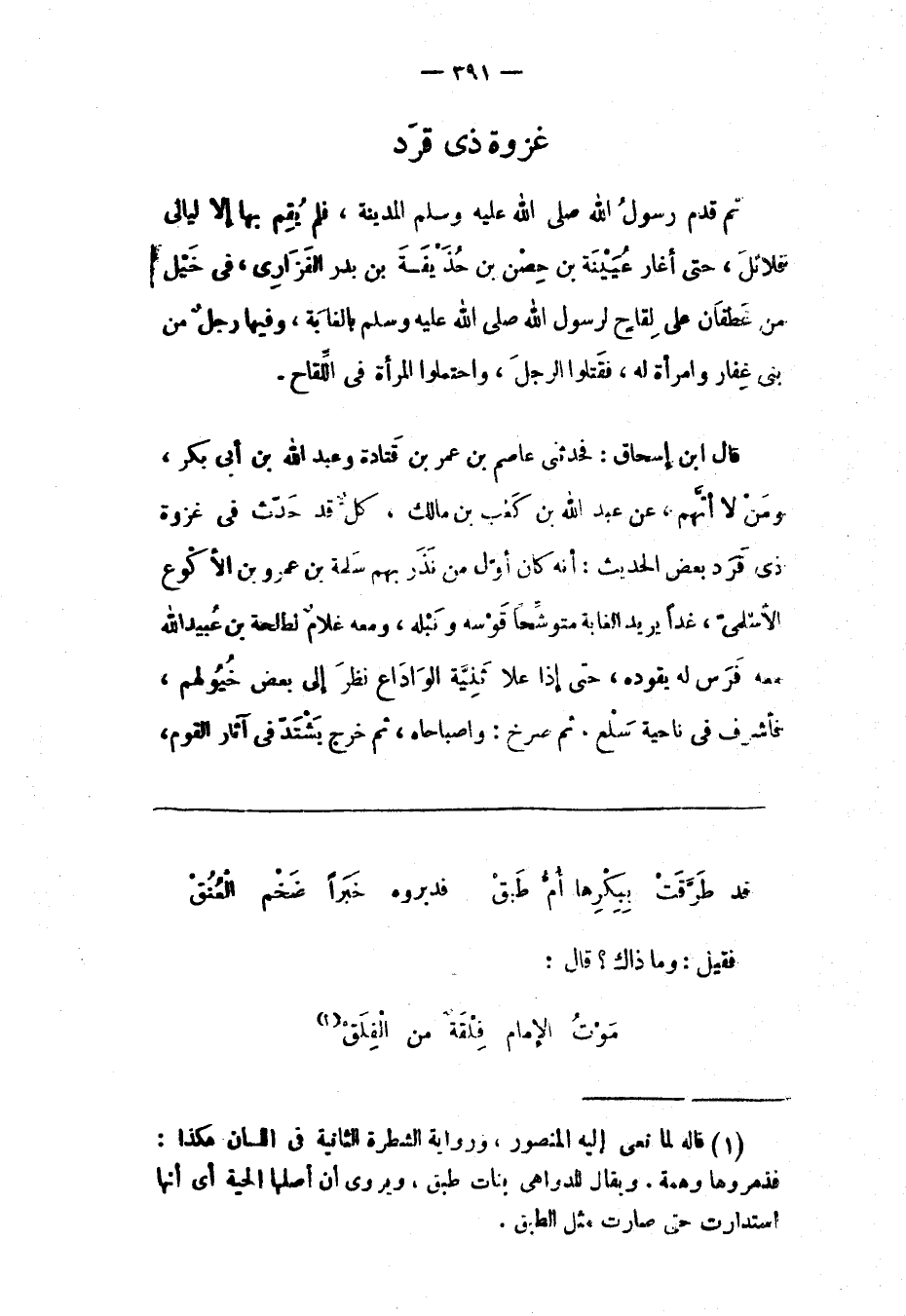 ثُمّ قَدِمَ رَسُولُ اللهِ صَلَّى اللَّهُ عَلَيْهِ وَسَلَّمَ الْمَدِينَةَ، فَلَمْ يُقِمْ بِهَا إلّا لَيَالِيَ قَلَائِلَ، حَتّى أَغَارَ عُيَيْنَةُ بْنُ حِصْنِ بْنِ حُذَيْفَةَ بْنِ بَدْرٍ الْفَزَارِيّ، فِي خَيْلٍ مِنْ غَطَفَانَ عَلَى لِقَاحٍ لِرَسُولِ اللهِ صَلّى اللهُ عَلَيْهِ وَسَلّمَ بِالْغَابَةِ، وَفِيهَا رَجُلٌ مِنْ بَنِي غِفَارٍ وَامْرَأَةٌ لَهُ، فَقَتَلُوا الرجل، واحتملوا المرأة فى اللّقاح.