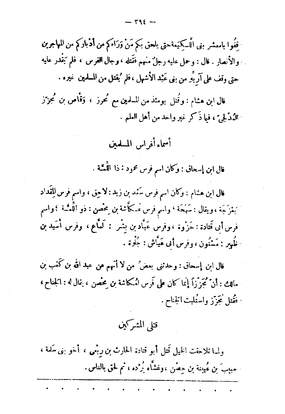 قَالَ ابْنُ هِشَامٍ: وَكَانَ اسْمُ فَرَسِ سَعْدِ بْنِ زَيْدٍ: لَاحِقَ، وَاسْمُ فَرَسِ الْمِقْدَادِ بَعْزَجَةُ، وَيُقَالُ: سُبْحَةُ، وَاسْمُ فَرَسِ عُكَاشَةَ بْنِ مِحْصَنٍ: ذو اللّمّةِ؛ وَاسْمُ فَرَسِ أَبِي قتادة: جزوة، وَفَرَسُ عَبّادِ بْنِ بِشْرٍ: لَمّاعٌ، وَفَرَسُ أُسَيْدِ بْنِ ظُهَيْرٍ: مَسْنُونٌ، وَفَرَسُ أَبِي عَيّاشٍ: جُلْوَةُ.