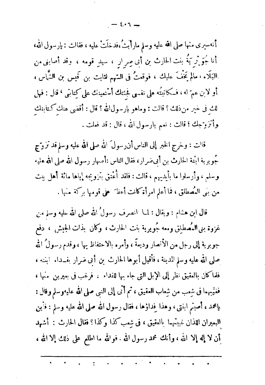 أنه سيرى منها صَلّى اللهُ عَلَيْهِ وَسَلّمَ مَا رَأَيْتُ، فَدَخَلَتْ عَلَيْهِ، فَقَالَتْ: يَا رَسُولَ اللهِ، أَنَا جُوَيْرِيَةُ بنت الحارث بن أبى صرار، سَيّدِ قَوْمِهِ، وَقَدْ أَصَابَنِي مِنْ الْبَلَاءِ، مَا لَمْ يَخْفَ عَلَيْك، فَوَقَعْت فِي السّهْمِ لِثَابِتِ بْنِ قَيْسِ بْنِ الشّمّاسِ، أَوْ لِابْنِ عَمّ لَهُ، فَكَاتَبْتُهُ عَلَى نَفْسِي فَجِئْتُك أَسْتَعِينُك عَلَى كِتَابَتِي، قَالَ: فَهَلْ لَك فِي خَيْرٍ مِنْ ذَلِكَ؟ قَالَتْ: وَمَا هُوَ يَا رَسُولَ اللهِ؟ قَالَ: أَقْضِي عَنْك كِتَابَتك وَأَتَزَوّجُك؛ قَالَتْ: نَعَمْ يَا رَسُولَ اللهِ، قَالَ: قَدْ فَعَلْت.