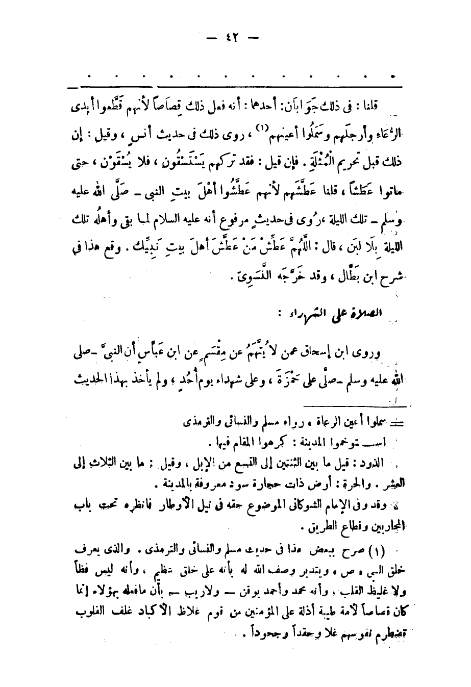 - سلموا أعين الرعاة» رواه مسلم والنسائى والترمذى استوخموا المدينة: كرهوا المقام فيها. الذود: قيل ما بين الثنتين إلى التسع من الإبل، وقيل: ما بين الثلاث إلى العشر. والحرة: أرض ذات حجارة سود معروفة بالمدينة. وقد وفى الإمام الشوكانى الموضوع حقه فى نيل الأوطار فانظره تحت باب المحاربين وقطاع الطريق.