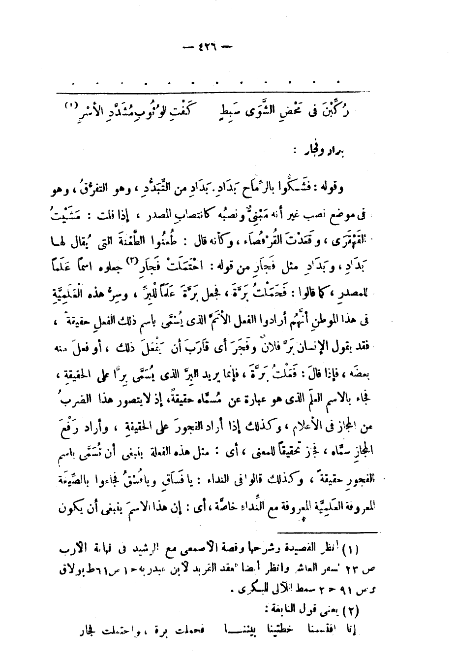 وَقَوْلُهُ: فَشَكّوا بِالرّمَاحِ بَدَادِ. بَدَادُ مِنْ التّبَدّدِ، وَهُوَ التّفَرّقُ، وَهُوَ فِي مَوْضِعِ نَصْبٍ غَيْرَ أَنّهُ مَبْنِيّ وَنَصْبُهُ كَانْتِصَابِ الْمَصْدَرِ، إذَا قُلْت: مَشَيْت الْقَهْقَرَى، وَقَعَدْت الْقُرْفُصَاءَ، وَكَأَنّهُ قَالَ: طَعَنُوا الطّعْنَةُ الّتِي يُقَالُ لَهَا بَدَادِ، وَبَدَادُ مِثْلُ فَجَارِ مِنْ قَوْلِهِ: احْتَمَلْت فَجَارِ «2» جَعَلُوهُ اسْمًا عَلَمًا لِلْمَصْدَرِ، كَمَا قَالُوا: فَحَمَلْت بَرّةَ، فَجُعِلَ بَرّةُ عَلَمًا لِلْبِرّ، وَسِرّ هَذِهِ الْعَلَمِيّةِ فِي هَذَا الْمَوْطِنِ أَنّهُمْ أَرَادُوا الْفِعْلَ الْأَتَمّ الّذِي يُسَمّى بِاسْمِ ذَلِكَ الْفِعْلِ حَقِيقَةً، فَقَدْ يَقُولُ الْإِنْسَانُ بَرّ فُلَانٌ وَفَجَرَ أَيْ قَارَبَ أَنْ يَفْعَلَ ذَلِك، أَوْ فَعَلَ مِنْهُ بَعْضَهُ، فَإِذَا قَالَ: فَعَلْت بَرّةَ، فَإِنّمَا يُرِيدُ الْبِرّ الّذِي يُسَمّى بِرّا عَلَى الْحَقِيقَةِ، فَجَاءَ بِالِاسْمِ الْعَلَمِ الّذِي هُوَ عِبَارَةٌ عَنْ مُسَمّاهُ حَقِيقَةً، إذْ لَا يُتَصَوّرُ هَذَا الضّرْبُ مِنْ الْمَجَازِ فِي الْأَعْلَامِ، وَكَذَلِكَ إذَا أَرَادَ الْفُجُورَ عَلَى الْحَقِيقَةِ، وَأَرَادَ رَفْعَ الْمَجَازِ سَمّاهُ، فَجَازَ تَحْقِيقًا لِلْمَعْنَى، أَيْ: مِثْلَ هَذِهِ الْفَعْلَةِ يَنْبَغِي أَنْ تُسَمّى بِاسْمِ الْفُجُورِ حَقِيقَةً، وَكَذَلِكَ قَالُوا فِي النّدَاءِ: يَا فَسَاقِ وَيَا فسق فجاؤا بِالصّيغَةِ الْمَعْرُوفَةِ الْعَلَمِيّةِ الْمَعْرُوفَةِ مَعَ النّدَاءِ خَاصّةً، أَيْ: إنّ هَذَا الِاسْمَ يَنْبَغِي أَنْ يَكُونَ