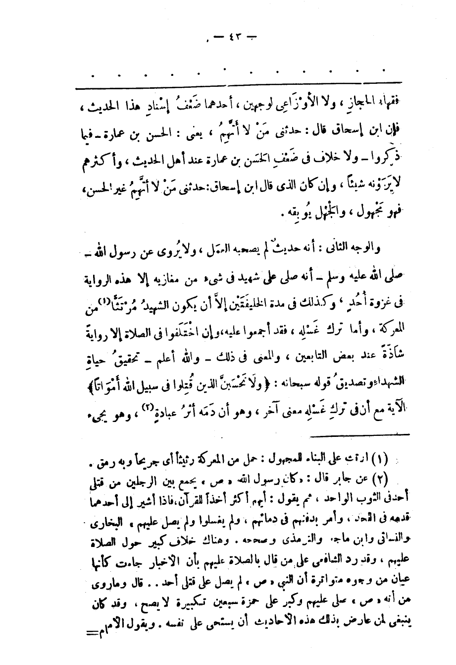 (2) عن جابر قال: «كان رسول الله «ص» يجمع بين الرجلين من قتلى أحد فى الثوب الواحد، ثم يقول: أيهم أكثر أخذا للقرآن، فاذا أشير إلى أحدهما قدمه فى اللحد، وأمر يدفنهم فى دمائهم، ولم يغسلوا ولم يصل عليهم» البخارى والنسائى وابن ماجه والترمذى وصححه. وهناك خلاف كبير حول الصلاة عليهم، وقد رد الشافعى على من قال بالصلاة عليهم بأن الأخبار جاءت كأنها عيان من وجوه متواترة أن النبى «ص» لم يصل على قتلى أحد.. قال وما روى من أنه «ص» صلى عليهم وكبر على حمزة سبعين تكبيرة لا يصح، وقد كان ينبغى لمن عارض بذلك هذه الأحاديث أن يستحى على نفسه. ويقول الأمام-