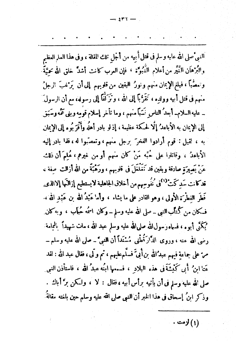 النّبِيّ صَلَّى اللَّهُ عَلَيْهِ وَسَلَّمَ فِي قَتْلِ أَبِيهِ مِنْ أَجْلِ تِلْكَ الْمَقَالَةِ، وَفِي هَذَا الْعِلْمُ الْعَظِيمُ وَالْبُرْهَانُ النّيّرُ مِنْ أَعْلَامِ النّبُوّةِ، فَإِنّ الْعَرَبَ كَانَتْ أَشَدّ خَلْقِ اللهِ حَمِيّةً وَتَعَصّبًا، فَبَلَغَ الْإِيمَانُ مِنْهُمْ وَنُورُ الْيَقِينِ مِنْ قُلُوبِهِمْ إلَى أَنْ يَرْغَبَ الرّجُلُ مِنْهُمْ فِي قَتْلِ أَبِيهِ وَوَلَدِهِ، تَقَرّبًا إلَى اللهِ، وَتَزَلّفًا إلَى رَسُولِهِ، مَعَ أَنّ الرّسُولَ- عَلَيْهِ السّلَامُ- أَبْعَدُ النّاسِ نَسَبًا مِنْهُمْ، وَمَا تَأَخّرَ إسْلَامُ قَوْمِهِ وَبَنِيّ عَمّهِ وَسَبَقَ إلَى الْإِيمَانِ بِهِ الْأَبَاعِدُ إلّا لِحِكْمَةِ عَظِيمَةٍ، إذْ لَوْ بَادَرَ أَهْلُهُ وَأَقْرَبُوهُ إلَى الْإِيمَانِ بِهِ، لَقِيلَ: قَوْمٌ أَرَادُوا الْفَخْرَ بِرَجُلِ مِنْهُمْ، وَتَعَصّبُوا لَهُ، فَلَمّا بَادَرَ إلَيْهِ الْأَبَاعِدُ، وَقَاتَلُوا عَلَى حُبّهِ مَنْ كَانَ مِنْهُمْ أَوْ مِنْ غَيْرِهِمْ، عُلِمَ أَنّ ذلك عن يصيرة صَادِقَةٍ وَيَقِينٍ قَدْ تَغَلْغَلَ فِي قُلُوبِهِمْ، وَرَهْبَةٍ مِنْ اللهِ أَزَالَتْ صِفَةً، قَدْ كَانَتْ سَدِكَتْ «1» فِي نُفُوسِهِمْ مِنْ أَخْلَاقِ الْجَاهِلِيّةِ لَا يَسْتَطِيعُ إزَالَتُهَا إلّا الّذِي فَطَرَ الْفِطْرَةَ الْأُولَى، وَهُوَ الْقَادِرُ عَلَى مَا يَشَاءُ، وَأَمّا عَبْدُ اللهِ بْنُ عَبْدِ اللهِ، فَكَانَ مِنْ كُتّابِ النّبِيّ- صَلَّى اللَّهُ عَلَيْهِ وَسَلَّمَ- وَكَانَ اسْمُهُ حُبَابٌ، وَبِهِ كَانَ يُكَنّى أَبُوهُ، فَسَمّاهُ رَسُولُ اللهِ صَلَّى اللَّهُ عَلَيْهِ وَسَلَّمَ عَبْدَ اللهِ، مَاتَ شَهِيدًا بِالْيَمَامَةِ رَضِيَ اللهُ عَنْهُ، وَرَوَى الدّارَقُطْنِيّ مُسْنَدًا أَنّ النّبِيّ- صَلَّى اللَّهُ عَلَيْهِ وَسَلَّمَ- مَرّ عَلَى جَمَاعَةٍ فِيهِمْ عَبْدُ اللهِ بْنُ أُبَيّ فَسَلّمَ عَلَيْهِمْ، ثُمّ وَلّى، فَقَالَ عَبْدُ اللهِ: لَقَدْ عَنَا ابْنُ أَبِي كَبْشَةَ فِي هَذِهِ الْبِلَادِ، فَسَمِعَهَا ابْنُهُ عَبْدُ اللهِ، فَاسْتَأْذَنَ النّبِيّ صَلَّى اللَّهُ عَلَيْهِ وَسَلَّمَ فِي أَنْ يَأْتِيَهُ بِرَأْسِ أَبِيهِ، فَقَالَ: لَا، وَلَكِنْ بِرّ أَبَاك وَذَكَرَ ابْنُ إسْحَاقَ فِي هَذَا الْخَبَرِ أَنّ النّبِيّ صَلَّى اللَّهُ عَلَيْهِ وَسَلَّمَ حِينَ بلغته مقالة