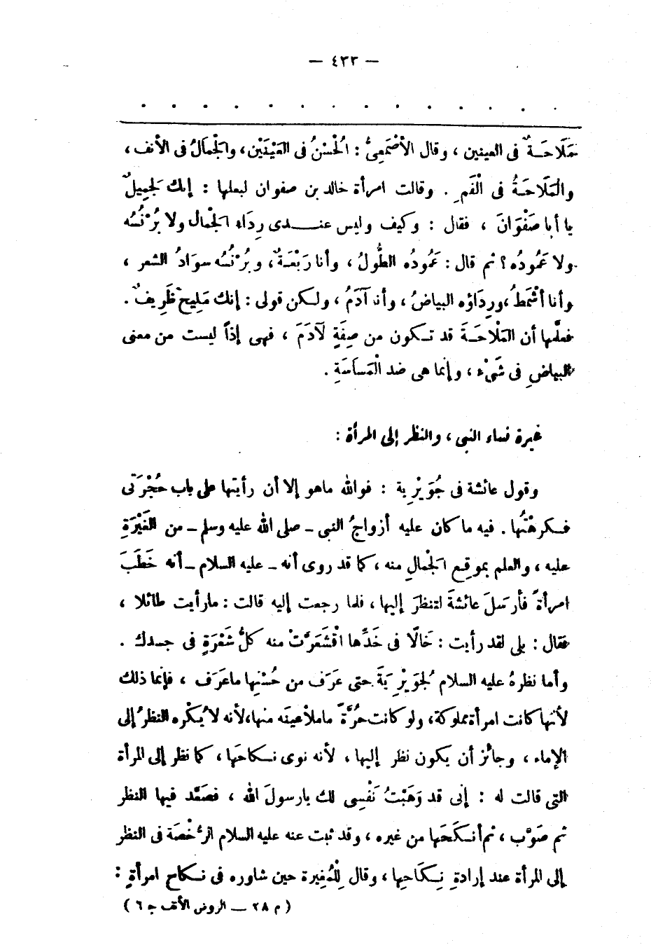 وَأَمّا نَظَرُهُ عَلَيْهِ السّلَامُ لِجُوَيْرِيَةَ حَتّى عَرَفَ مِنْ حُسْنِهَا مَا عَرَفَ، فَإِنّمَا ذَلِكَ لِأَنّهَا كَانَتْ امْرَأَةً مَمْلُوكَةً، وَلَوْ كَانَتْ حُرّةً مَا مَلَأَ عَيْنَهُ مِنْهَا، لِأَنّهُ لَا يُكْرَهُ النّظَرُ إلَى الْإِمَاءِ، وَجَائِزٌ أَنْ يَكُونَ نَظَرَ إلَيْهَا، لِأَنّهُ نَوَى نِكَاحَهَا، كَمَا نَظَرَ إلَى الْمَرْأَةِ الّتِي قَالَتْ لَهُ: إنّي قَدْ وَهَبْت نَفْسِي لَك يَا رَسُولَ اللهِ، فَصَعّدَ فِيهَا النّظَرَ ثُمّ صَوّبَ، ثُمّ أَنْكَحَهَا مِنْ غَيْرِهِ، وَقَدْ ثَبَتَ عَنْهُ عَلَيْهِ السّلَامُ الرّخْصَةُ فِي النّظَرِ إلَى الْمَرْأَةِ عِنْدَ إرَادَةِ نِكَاحِهَا، وَقَالَ لِلْمُغِيرَةِ حِينَ شَاوَرَهُ فِي نِكَاحِ امْرَأَةٍ: