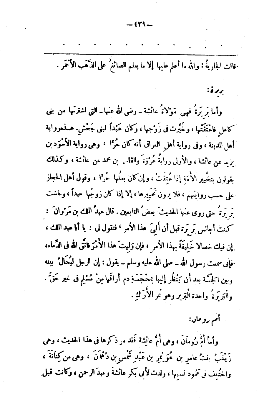 وَأَمّا بَرِيرَةُ فَهِيَ مَوْلَاةُ عَائِشَةَ- رَضِيَ اللهُ عَنْهَا- الّتِي اشْتَرَتْهَا مِنْ بَنِي كَاهِلٍ فَأَعْتَقَتْهَا، وَخُيّرَتْ فِي زَوْجِهَا، وَكَانَ عَبْدًا لِبَنِي جَحْشٍ. هَذِهِ رِوَايَةُ أَهْلِ الْمَدِينَةِ، وَفِي رِوَايَةِ أَهْلِ الْعِرَاقِ أَنّهُ كَانَ حُرّا، وَهِيَ رِوَايَةُ الْأَسْوَدِ بْنِ يَزِيدَ عَنْ عَائِشَةَ، وَالْأَوْلَى رِوَايَةُ عُرْوَةَ وَالْقَاسِمِ، بْنِ مُحَمّدٍ عَنْ عَائِشَةَ، وَكَذَلِكَ يَقُولُونَ بِتَخْيِيرِ الْأَمَةِ إذَا عَتَقَتْ، وَإِنْ كَانَ بَعْلُهَا حُرّا، وَقَوْلُ أَهْلِ الْحِجَازِ عَلَى حَسَبِ رِوَايَتِهِمْ، فَلَا يَرَوْنَ تَخْيِيرَهَا، إلّا إذَا كَانَ زَوْجُهَا عَبْدًا، وَعَاشَتْ بَرِيرَةُ حَتّى رَوَى عَنْهَا الْحَدِيثَ بَعْضُ التّابِعِينَ. قَالَ عَبْدُ الْمَلِكِ بْنِ مَرْوَانَ: