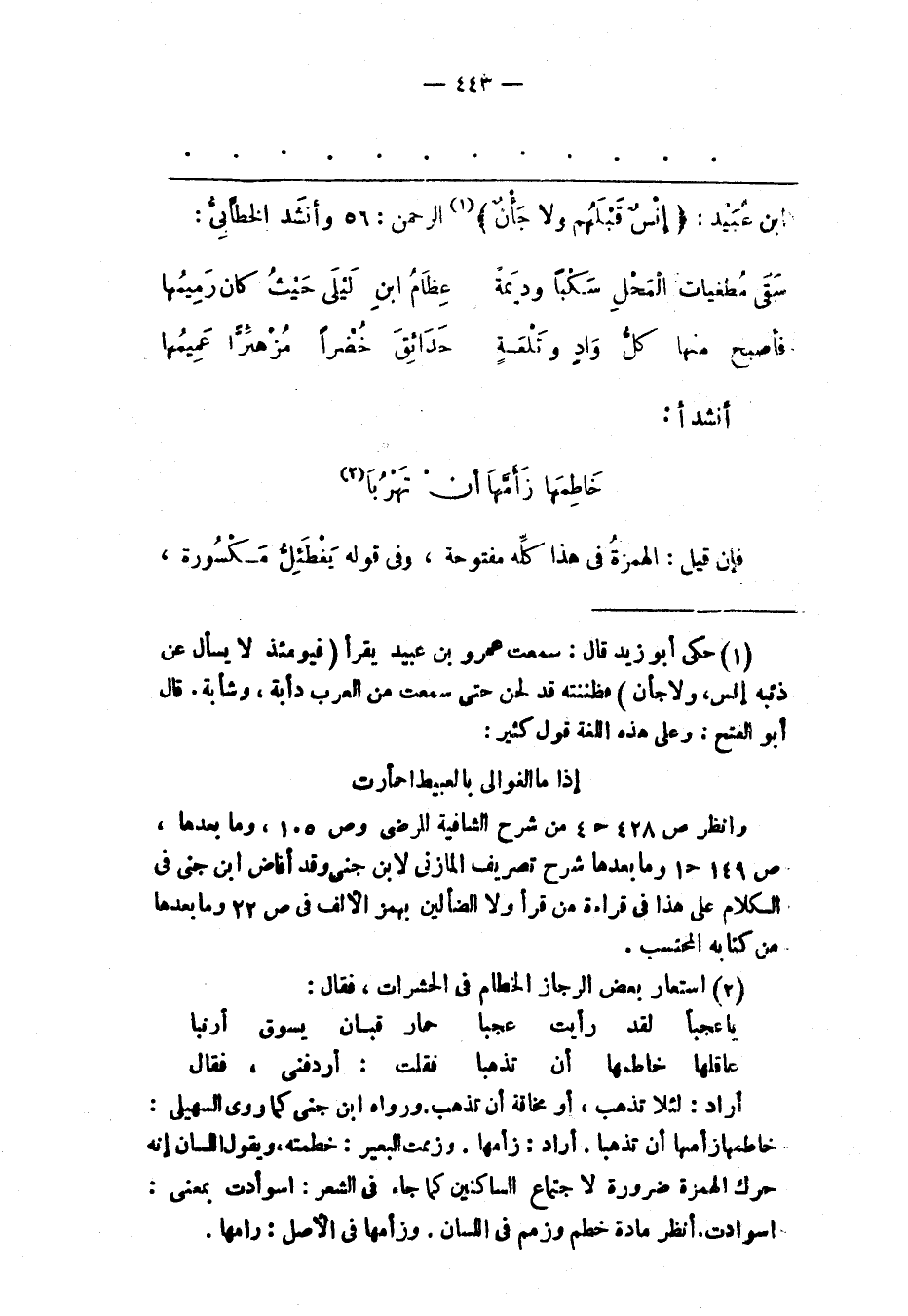 (1) حكى أبو زيد قال: سمعت عمرو بن عبيد يقرأ (فيومئذ لا يسأل عن ذئبه إنس، ولا جأن) فظننته قد لحن حتى سمعت من العرب دأبة، وشأبة. قال أبو الفتح: وعلى هذه اللغة قول كثير: إذا ما الغوالى بالعبيط احمأرت وانظر ص 428 ح 4 من شرح الشافية المرضى وص 105، وما بعدها، ص 149 ح 1 وما بعدها شرح تصريف المازنى لابن جنى وقد أفاض ابن جنى فى الكلام على هذا فى قراءة من قرأ ولا الضألين بهمز الألف فى ص 22 وما بعدها من كتابه المحتسب.