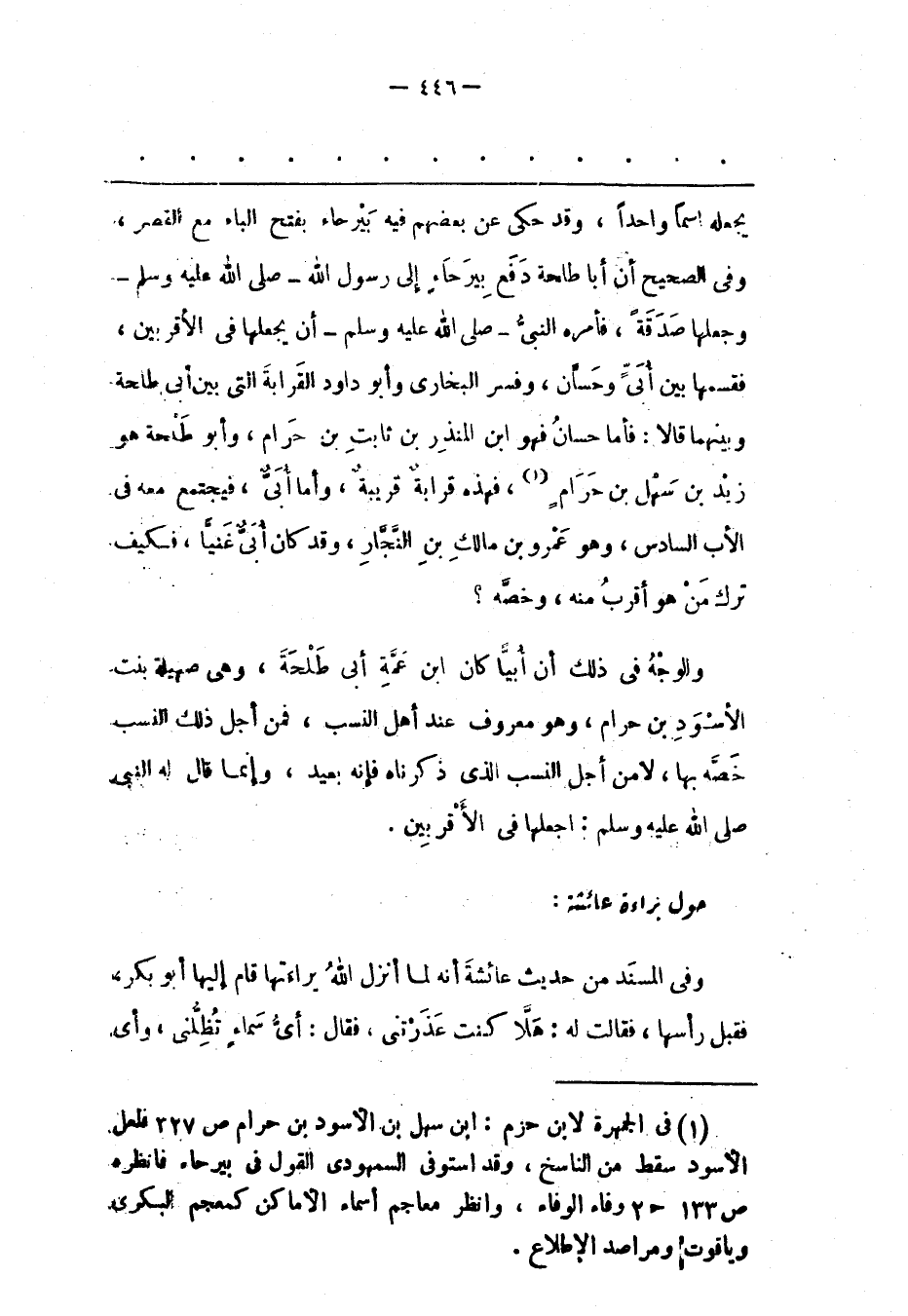 (1) فى الجمهرة لابن حزم: ابن سهل بن الأسود بن حرام ص 227 فلعل الأسود سقط من الناسخ، وقد استوفى السمهودى القول فى بيرحاء فانظره ص 133 ح 2 وفاء الوفاء، وانظر معاجم أسماء الأماكن كمعجم البكرى وياقوت ومراصد الإطلاع.
