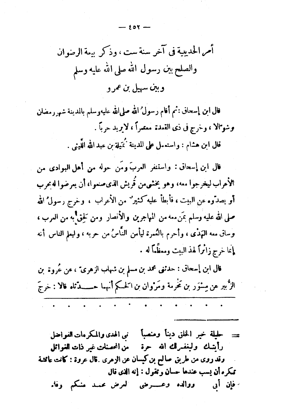 قال ابن إسحاق: حدثني محمد بن مسلم بْنِ شِهَابٍ الزّهْرِيّ، عَنْ عُرْوَةَ بْنِ الزّبَيْرِ عَنْ مِسْوَرِ بْنِ مَخْرَمَةَ وَمَرْوَانَ بْنِ الْحَكَمِ أنهما حدّثاه قالا: خرج