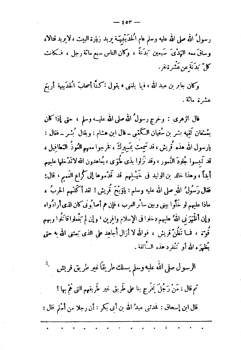 فَقَالَ رَسُولُ اللهِ صَلَّى اللَّهُ عَلَيْهِ وَسَلَّمَ: يَا وَيْحَ قُرَيْشٍ! لَقَدْ أَكَلَتْهُمْ الْحَرْبُ، مَاذَا عَلَيْهِمْ لَوْ خَلّوْا بَيْنِي وَبَيْنَ سَائِرِ الْعَرَبِ، فَإِنْ هُمْ أَصَابُونِي كَانَ الّذِي أَرَادُوا، وَإِنْ أَظْهَرَنِي اللهُ عَلَيْهِمْ دَخَلُوا فِي الْإِسْلَامِ وَافِرِينَ، وَإِنْ لَمْ يَفْعَلُوا قَاتَلُوا وَبِهِمْ قُوّةٌ، فَمَا تَظُنّ قُرَيْشٌ، فَوَاَللهِ لَا أَزَالُ أُجَاهِدُ عَلَى الّذِي بَعَثَنِي اللهُ بِهِ حَتّى يُظْهِرَهُ اللهُ أَوْ تَنْفَرِدَ هَذِهِ السّالفة.