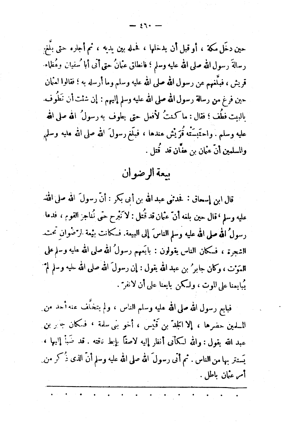 قَالَ ابْنُ إسْحَاقَ: فَحَدّثَنِي عَبْدُ اللهِ بْنُ أَبِي بَكْرٍ: أَنّ رَسُولَ اللهِ صَلّى اللهُ عَلَيْهِ وَسَلّمَ، قَالَ حِينَ بَلَغَهُ أَنّ عُثْمَانَ قَدْ قُتِلَ: لَا نَبْرَحُ حَتّى نُنَاجِزَ الْقَوْمَ، فَدَعَا رَسُولُ اللهِ صَلَّى اللَّهُ عَلَيْهِ وَسَلَّمَ النّاسَ إلَى الْبَيْعَةِ. فَكَانَتْ بَيْعَةُ الرّضْوَانِ تَحْتَ الشّجَرَةِ، فَكَانَ النّاسُ يَقُولُونَ: بَايَعَهُمْ رَسُولُ اللهِ صَلّى اللهُ عَلَيْهِ وَسَلّمَ عَلَى الْمَوْتِ، وَكَانَ جَابِرُ بْنُ عَبْدِ اللهِ يَقُولُ: إنّ رَسُولَ اللهِ صَلّى اللهُ عَلَيْهِ وَسَلّمَ لَمْ يُبَايِعْنَا عَلَى الْمَوْتِ، وَلَكِنْ بَايَعَنَا عَلَى أَنْ لَا نفرّ.