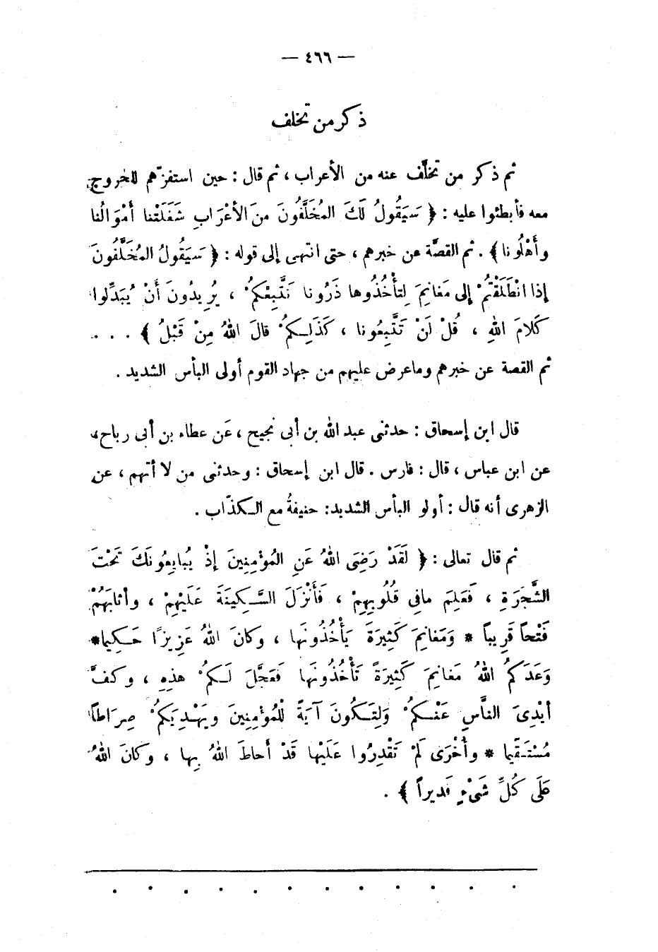 ثُمّ ذَكَرَ مَنْ تَخَلّفَ عَنْهُ مِنْ الْأَعْرَابِ، ثُمّ قَالَ: حِينَ اسْتَفَزّهُمْ لِلْخُرُوجِ مَعَهُ فَأَبْطَئُوا عَلَيْهِ: سَيَقُولُ لَكَ الْمُخَلَّفُونَ مِنَ الْأَعْرابِ شَغَلَتْنا أَمْوالُنا وَأَهْلُونا. ثُمّ الْقِصّةُ عَنْ خَبَرِهِمْ، حَتّى انْتَهَى إلَى قَوْلِهِ: سَيَقُولُ الْمُخَلَّفُونَ إِذَا انْطَلَقْتُمْ إِلى مَغانِمَ لِتَأْخُذُوها ذَرُونا نَتَّبِعْكُمْ، يُرِيدُونَ أَنْ يُبَدِّلُوا كَلامَ اللَّهِ، قُلْ لَنْ تَتَّبِعُونا، كَذلِكُمْ قالَ اللَّهُ مِنْ قَبْلُ..
