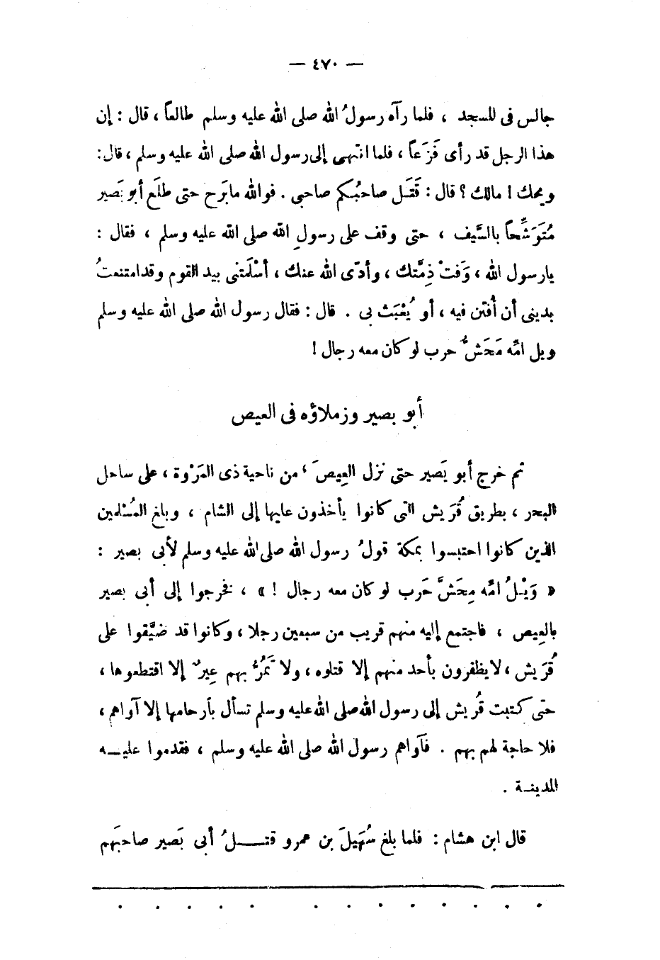 ويحك! مالك؟ قَالَ: قَتَلَ صَاحِبُكُمْ صَاحِبِي. فَوَاَللهِ مَا بَرِحَ حَتّى طَلَعَ أَبُو بَصِيرٍ مُتَوَشّحًا بِالسّيْفِ، حَتّى وَقَفَ عَلَى رَسُولِ اللهِ صَلَّى اللَّهُ عَلَيْهِ وَسَلَّمَ، فَقَالَ: