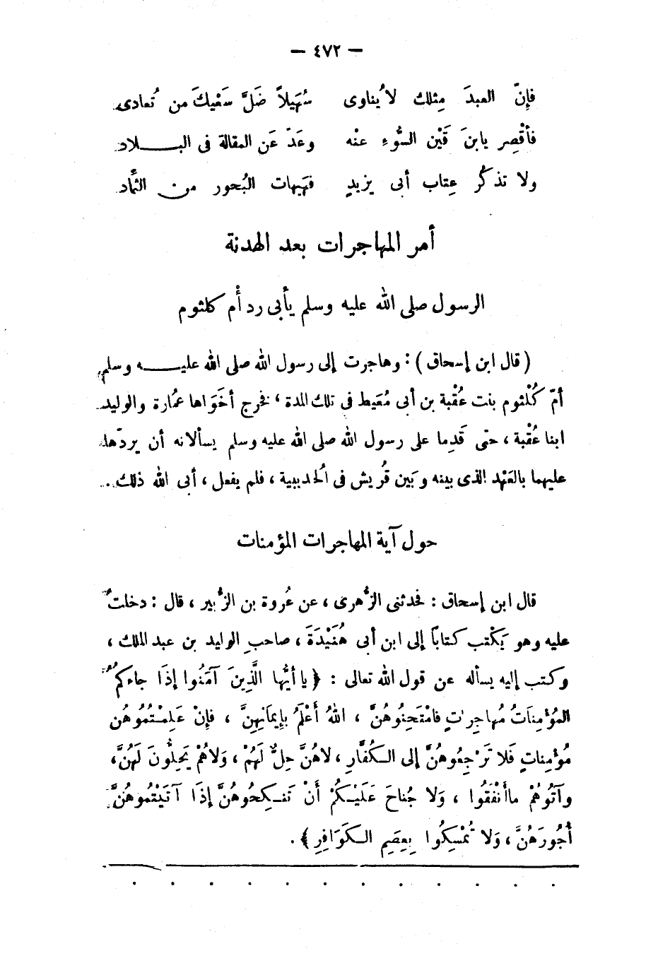 قَالَ ابْنُ إسْحَاقَ: فَحَدّثَنِي الزّهْرِيّ، عَنْ عُرْوَةَ بْنِ الزّبَيْرِ، قَالَ: دَخَلْتُ عَلَيْهِ وَهُوَ يَكْتُبُ كِتَابًا إلَى ابْنِ أَبِي هُنَيْدَةَ، صَاحِبِ الْوَلِيدِ بْنِ عَبْدِ الْمَلِكِ، وَكَتَبَ إلَيْهِ يَسْأَلُهُ عَنْ قَوْلِ اللهِ تَعَالَى: يَا أَيُّهَا الَّذِينَ آمَنُوا إِذا جاءَكُمُ الْمُؤْمِناتُ مُهاجِراتٍ فَامْتَحِنُوهُنَّ، اللَّهُ أَعْلَمُ بِإِيمانِهِنَّ، فَإِنْ عَلِمْتُمُوهُنَّ مُؤْمِناتٍ فَلا تَرْجِعُوهُنَّ إِلَى الْكُفَّارِ، لَا هُنَّ حِلٌّ لَهُمْ، وَلا هُمْ يَحِلُّونَ لَهُنَّ، وَآتُوهُمْ مَا أَنْفَقُوا، وَلا جُناحَ عَلَيْكُمْ أَنْ تَنْكِحُوهُنَّ إِذا آتَيْتُمُوهُنَّ أُجُورَهُنَّ، وَلا تُمْسِكُوا بِعِصَمِ الْكَوافِرِ.
