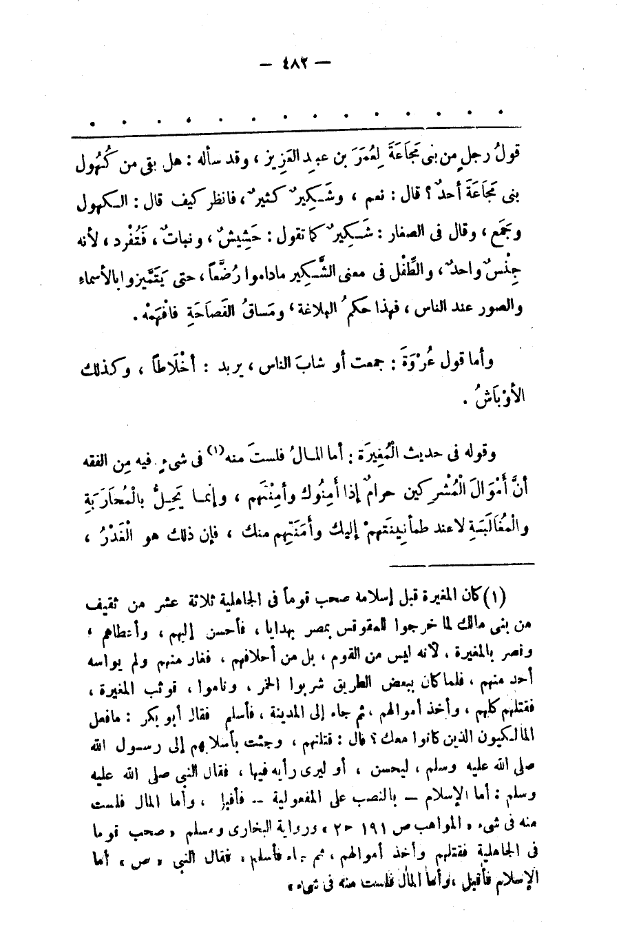 قَوْلُ رَجُلٍ مِنْ بَنِي مَجَاعَةَ لِعُمَرِ بْنِ عَبْدِ الْعَزِيزِ، وَقَدْ سَأَلَهُ: هَلْ بَقِيَ مِنْ كُهُولِ بَنِي مَجَاعَةَ أَحَدٌ؟ قَالَ: نَعَمْ، وَشَكِيرٌ كَثِيرٌ، فَانْظُرْ كَيْفَ قَالَ: الْكُهُولُ وَجَمَعَ، وَقَالَ فِي الصّغَارِ: شَكِيرٌ كَمَا تَقُولُ: حَشِيشٌ، وَنَبَاتٌ، فَتُفْرَدُ، لِأَنّهُ جِنْسٌ وَاحِدٌ، وَالطّفْلُ فِي مَعْنَى الشّكِيرِ مَا دَامُوا رُضّعًا، حَتّى يَتَمَيّزُوا بِالْأَسْمَاءِ وَالصّوَرِ عِنْدَ النّاسِ، فَهَذَا حُكْمُ الْبَلَاغَةِ، وَمَسَاقُ الفصاحة فافهمه.