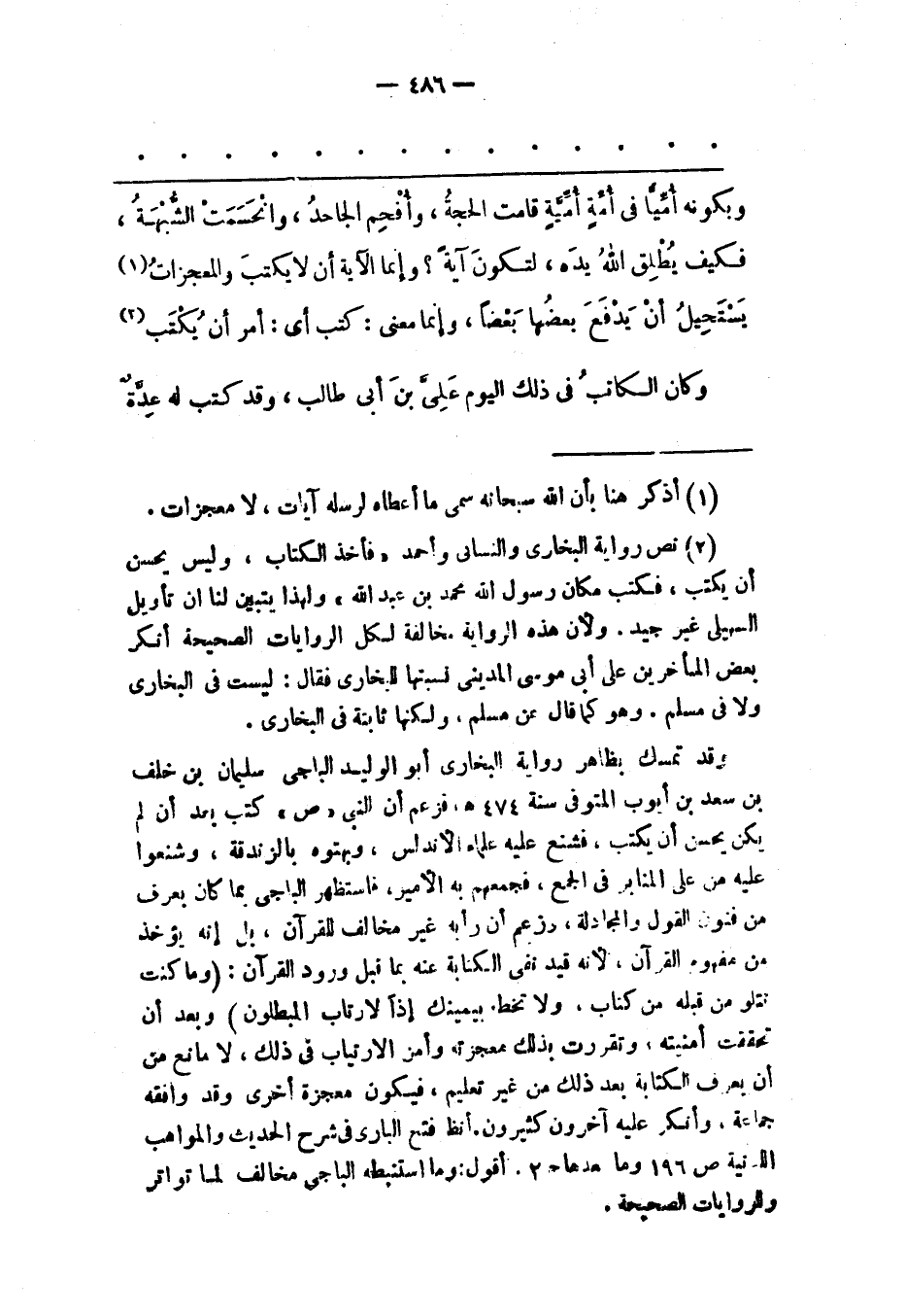 (2) نص رواية البخارى والنسائى وأحمد «فأخذ الكتاب، وليس يحسن أن يكتب، فكتب مكان رسول الله محمد بن عبد الله» ولهذا يتبين لنا ان تأويل السهيلى غير جيد. ولأن هذه الرواية مخالفة لكل الروايات الصحيحة أنكر بعض المأخرين على أبى موسى المدينى نسبتها للبخارى فقال: ليست فى البخارى ولا فى مسلم. وهو كما قال عن مسلم، ولكنها ثابتة فى البخارى. وقد تمسك بظاهر رواية البخارى أبو الوليد الباجى سليمان بن خلف بن سعد بن أيوب المتوفى سنة 474 هـ، فزعم أن النبى «ص» كتب بعد أن لم يكن يحسن أن يكتب، فشنع عليه علماء الأندلس، وبهتوه بالزندقة، وشنعوا عليه من على المنابر فى الجمع، فجمعهم به الأمير، فاستظهر الباجى بما كان يعرف من فنون القول والمجادلة، وزعم أن رأيه غير مخالف للقرآن، بل إنه يؤخذ من مفهوم القرآن، لأنه قيد نفى الكتابة عنه بما قبل ورود القرآن: (وَما كُنْتَ تَتْلُوا مِنْ قَبْلِهِ مِنْ كِتابٍ، وَلا تَخُطُّهُ بِيَمِينِكَ إِذاً لَارْتابَ الْمُبْطِلُونَ) وبعد أن تحققت أمنيته، وتقررت بذلك معجزته وأمن الارتياب فى ذلك، لا مانع من أن يعرف الكتابة بعد ذلك من غير تعليم، فيكون معجزة أخرى وقد وافقه جماعة، وأنكر عليه آخرون كثيرون. أنظر فتح البارى فى شرح الحديث والمواهب اللدنية ص 196 وما عدها ح 2. أقول: وما استنبطه الباجى مخالف لما تواتر وللروايات الصحيحة.