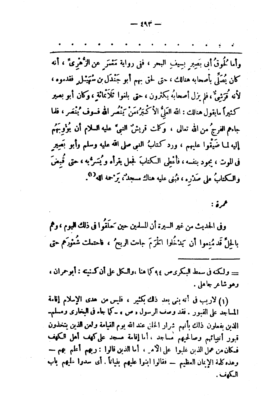 وَأَمّا لُحُوقُ أَبِي بَصِيرٍ بِسَيْفِ الْبَحْرِ، فَفِي رِوَايَةِ مَعْمَرٍ عَنْ الزّهْرِيّ، أَنّهُ كَانَ يُصَلّي بِأَصْحَابِهِ هُنَالِكَ، حَتّى لَحِقَ بِهِمْ أَبُو جَنْدَلِ بْنُ سُهَيْلٍ فَقَدّمُوهُ، لِأَنّهُ قُرَشِيّ، فَلَمْ يَزَلْ أَصْحَابُهُ يَكْثُرُونَ، حَتّى بَلَغُوا ثَلَاثَمِائَةٍ، وَكَانَ أَبُو بَصِيرٍ كَثِيرًا مَا يَقُولُ هُنَالِكَ: اللهُ الْعَلِيّ الْأَكْبَرُ، مَنْ يَنْصُرُ اللهَ فَسَوْفَ يُنْصَرْ، فَلَمّا جَاءَهُمْ الْفَرَجُ مِنْ اللهِ تَعَالَى، وَكَلّمَتْ قُرَيْشٌ النبىّ عليه السلام أَنْ يُؤْرِبَهُمْ إلَيْهِ لَمّا ضَيّقُوا عَلَيْهِمْ، وَرَدَ كِتَابُ النّبِيّ صَلَّى اللَّهُ عَلَيْهِ وَسَلَّمَ وَأَبُو بَصِيرٍ فِي الْمَوْتِ، يَجُودُ بِنَفْسِهِ، فَأُعْطِي الْكِتَابَ فجعل يقرأه ويسرّبه، حَتّى قُبِضَ وَالْكِتَابُ عَلَى صَدْرِهِ، فَبُنِيَ عَلَيْهِ هُنَاكَ مَسْجِدٌ، يَرْحَمُهُ اللهُ «1» .
