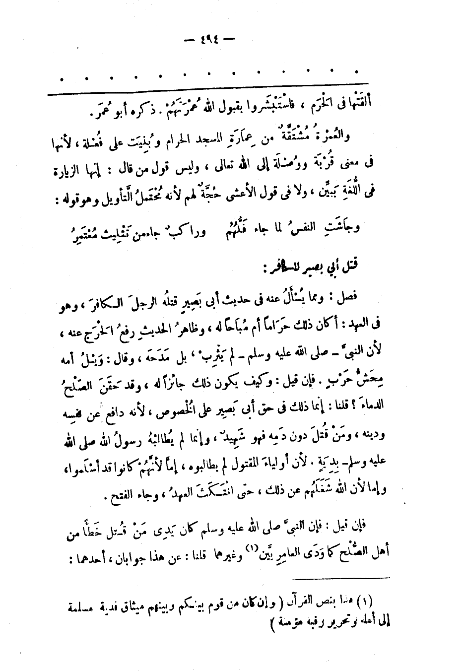 فَصْلٌ: وَمِمّا يُسْأَلُ عَنْهُ فِي حَدِيثِ أَبِي بَصِيرٍ قَتْلُهُ الرّجُلَ الْكَافِرَ، وَهُوَ فِي الْعَهْدِ: أَكَانَ ذَلِكَ حَرَامًا أَمْ مُبَاحًا لَهُ، وَظَاهِرُ الْحَدِيثِ رَفْعُ الْحَرَجِ عَنْهُ، لِأَنّ النّبِيّ- صَلَّى اللَّهُ عَلَيْهِ وَسَلَّمَ- لَمْ يُثَرّبْ، بَلْ مَدَحَهُ، وَقَالَ: وَيْلُ أُمّهِ مِحَشّ حَرْبٍ. فَإِنْ قِيلَ: وَكَيْفَ يَكُونُ ذَلِكَ جَائِزًا لَهُ، وَقَدْ حَقَنَ الصّلْحُ الدّمَاءَ؟ قُلْنَا: إنّمَا ذَلِكَ فِي حَقّ أَبِي بَصِيرٍ عَلَى الْخُصُوصِ، لِأَنّهُ دَافَعَ عَنْ نَفْسِهِ وَدِينِهِ، وَمَنْ قُتِلَ دُونَ دَمِهِ فَهُوَ شَهِيدٌ، وَإِنّمَا لَمْ يُطَالِبْهُ رَسُولُ اللهِ صَلَّى اللَّهُ عَلَيْهِ وَسَلّمَ- بِدِيَةِ. لأن أَوْلِيَاءَ الْمَقْتُولِ لَمْ يُطَالِبُوهُ، إمّا لِأَنّهُمْ كَانُوا قَدْ أَسْلَمُوا، وَإِمّا لِأَنّ اللهَ شَغَلَهُمْ عَنْ ذَلِكَ، حَتّى انْتَكَثَ الْعَهْدُ، وَجَاءَ الْفَتْحُ.