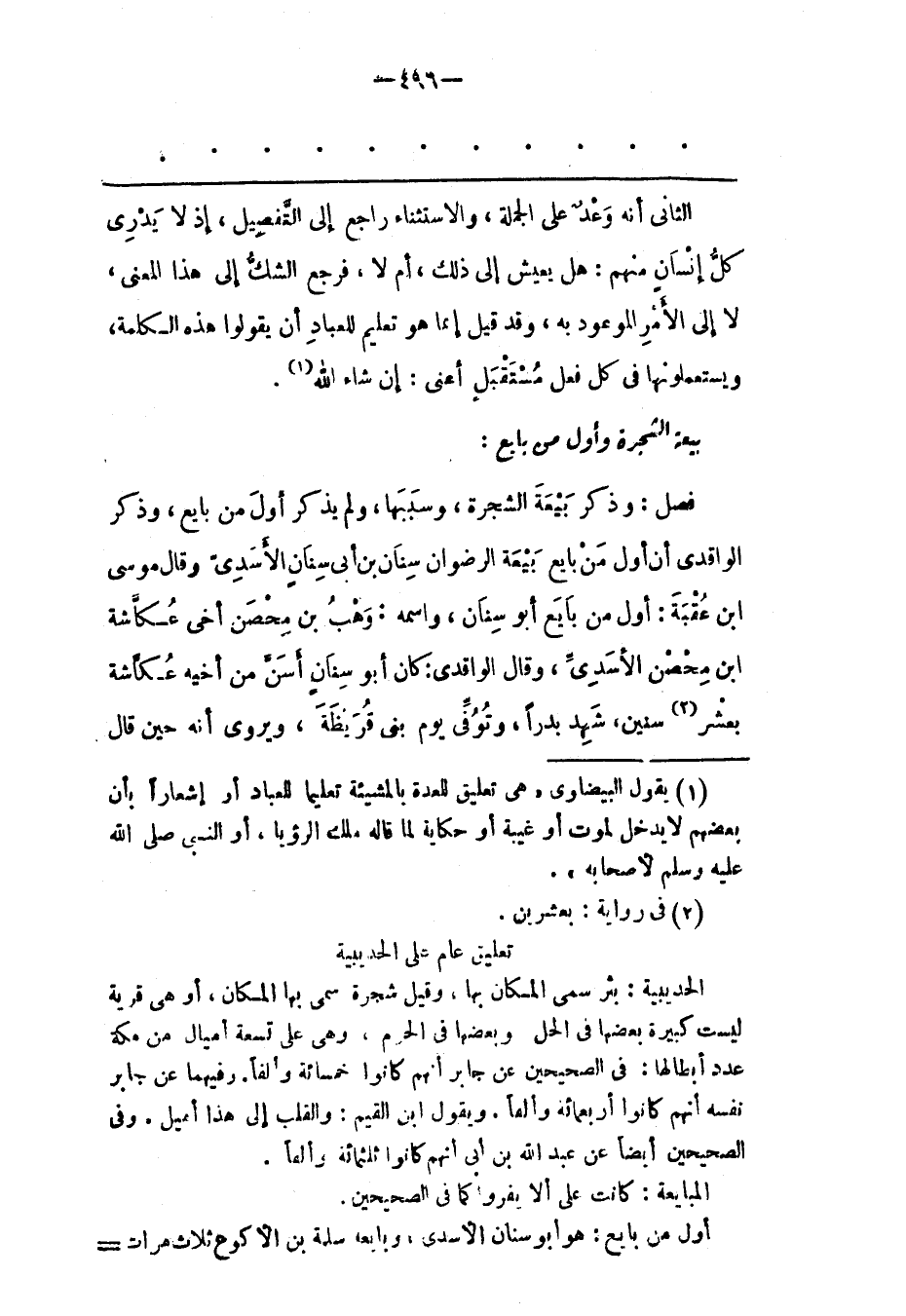 (2) فى رواية: بعشرين. تعليق عام على الحديبية الحديبية: بئر سمى المكان بها، وقيل شجرة سمى بها المكان، أو هى قرية ليست كبيرة بعضها فى الحل وبعضها فى الحرم، وهى على تسعة أميال من مكة عدد أبطالها: فى الصحيحين عن جابر أنهم كانوا خمسائة وألفا. وفيهما عن جابر نفسه أنهم كانوا أربعمائة وألفا. ويقول ابن القيم: والقلب إلى هذا أميل. وفى الصحيحين أيضا عن عبد الله بن أبى أنهم كانوا ثلثمائة وألفا. المبايعة: كانت على ألا يفرو كما فى الصحيحين. أول من بايع: هو أبو سنان الأسدى، وبايعه سلمة بن الأكوع ثلاث مرات-