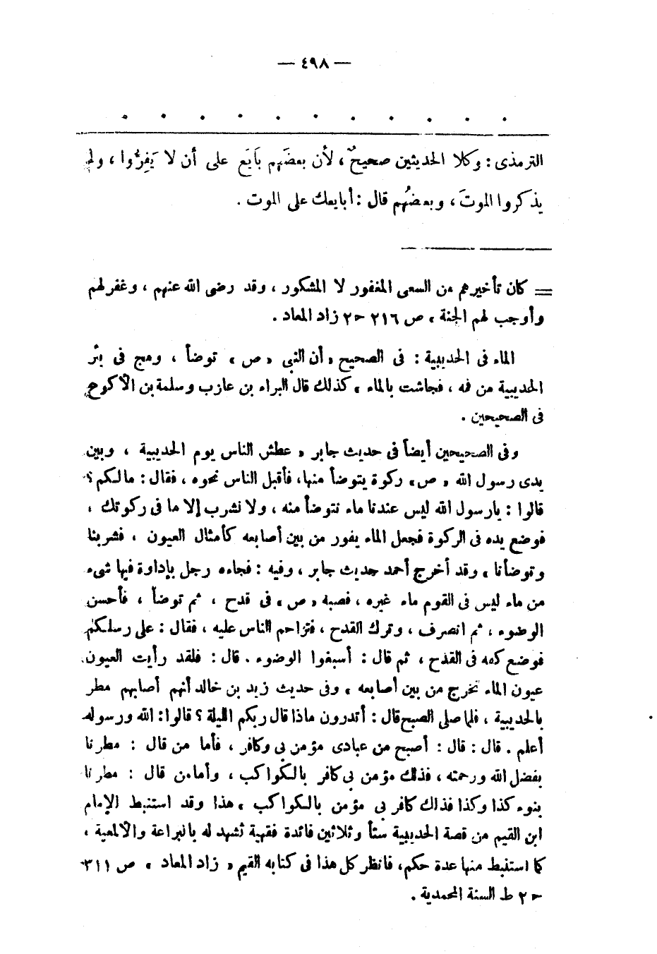 - كان تأخيرهم من السعى المغفور لا المشكور، وقد رضى الله عنهم، وغفر لهم وأوجب لهم الجنة» ص 216 ح 2 زاد المعاد. الماء فى الحديبية: فى الصحيح «أن النبى «ص» توضأ، ومج فى بئر الحديبية من فمه، فجاشت بالماء» كذلك قال البراء بن عازب وسلمة بن الأكوع فى الصحيحين. وفى الصحيحين أيضا فى حديث جابر «عطش الناس يوم الحديبية، وبين يدى رسول الله «ص» ركوة يتوضأ منها، فأقبل الناس نحوه، فقال: ما لكم، قالوا: يا رسول الله ليس عندنا ماء نتوضأ منه، ولا نشرب إلا ما فى ركوتك، فوضع يده فى الركوة فجعل الماء يفور من بين أصابعه كأمثال العيون، فشربنا وتوضأنا» وقد أخرج أحمد حديث جابر، وفيه: فجاءه رجل بإداوة فيها شىء من ماء ليس فى القوم ماء غيره، فصبه «ص» فى قدح، ثم توضأ، فأحسن الوضوء، ثم انصرف، وترك القدح، فتزاحم الناس عليه، فقال: على رسلكم فوضع كفه فى القدح، ثم قال: أسبغوا الوضوء. قال: فلقد رأيت العيون عيون الماء تخرج من بين أصابعه» وفى حديث زيد بن خالد أنهم أصابهم مطر بالحديبية، فلما صلى الصبح قال: أتدرون ماذا قال ربكم الليلة؟ قالوا: الله ورسوله أعلم. قال: قال: أصبح من عبادى مؤمن بى وكافر، فأما من قال: مطرنا بفضل الله ورحمته، فذلك مؤمن بى كافر بالكواكب، وأما من قال: مطرنا بنوء كذا وكذا فذلك كافر بى مؤمن بالكواكب، هذا وقد استنبط الامام ابن القيم من قصة الحديبية ستأ وثلاثين فائدة فقهية تشهد له بالبراعة والألمعية، كما استنبط منها عدة حكم، فانظر كل هذا فى كتابه القيم «زاد المعاد» ص 311 ح 2 ط السنة المحمدية.
