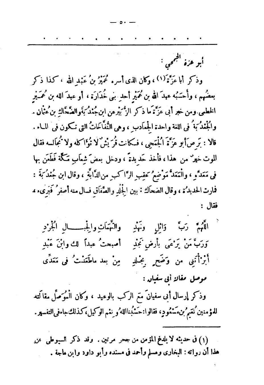 وَذَكَرَ أَبَا عَزّةَ «1» ، وَكَانَ الّذِي أَسَرَهُ عُمَيْرُ بْنُ عَبْدِ اللهِ، كَذَا ذَكَرَ بَعْضُهُمْ، وَأَحْسَبُهُ عَبْدَ اللهِ بْنَ عُمَيْرٍ أَحَدَ بَنِي خُدَارَةَ، أَوْ عَبْدَ اللهِ بْنَ عُمَيْرٍ الْخَطْمِيّ وَمِنْ خَبَرِ أَبِي عَزّةَ مَا ذَكَرَ الزّبَيْرُ عَنْ ابْنِ جُعْدُبَةَ وَالضّحّاكِ بْنِ عُثْمَانَ.