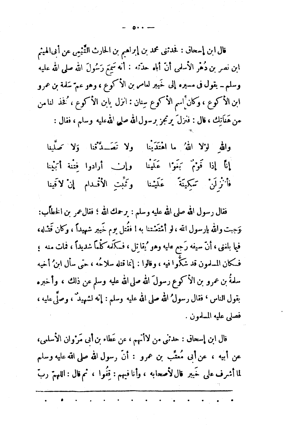 قَالَ ابْنُ إسْحَاقَ: فَحَدّثَنِي مُحَمّدُ بْنُ إبْرَاهِيمَ بن الحارث التّيمى عن أبى الهيثم ابن نَصْرِ بْنِ دَهْرٍ الْأَسْلَمِيّ أَنّ أَبَاهُ حَدّثَهُ: أَنّهُ سَمِعَ رَسُولُ اللهِ صَلَّى اللَّهُ عَلَيْهِ وَسَلَّمَ- يَقُولُ فِي مَسِيرِهِ إلَى خَيْبَرَ لِعَامِرِ بْنِ الْأَكْوَعِ، وَهُوَ عَمّ سَلَمَةَ بْنِ عَمْرِو ابن الأكوع، وكان إسم الأكوع سنان: انزل يابن الأكوع، فخذ لنا من مِنْ هَنَاتِك، قَالَ: فَنَزَلَ يَرْتَجِزُ بِرَسُولِ اللهِ صَلّى اللهُ عَلَيْهِ وَسَلّمَ، فَقَالَ: