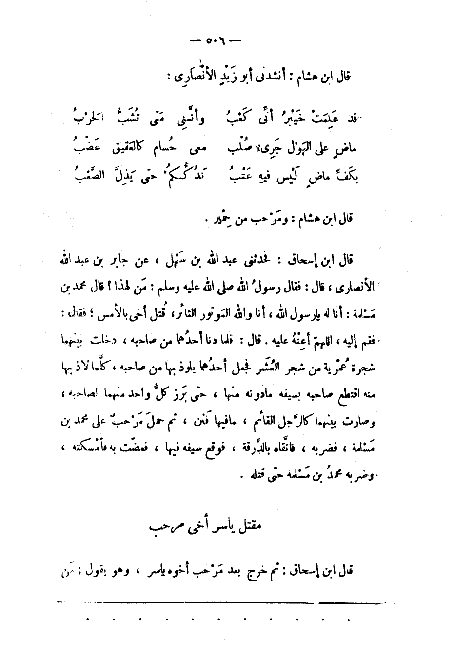 قَالَ ابْنُ إسْحَاقَ: ثُمّ خَرَجَ بَعْدَ مَرْحَبٍ أَخُوهُ يَاسِرٌ، وَهُوَ يقول: من