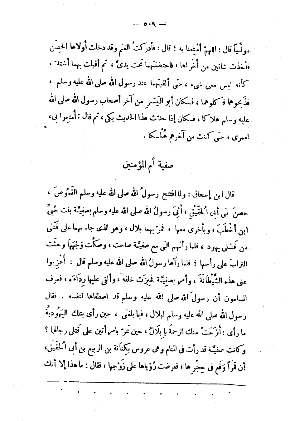 قَالَ ابْنُ إسْحَاقَ: وَلَمّا افْتَتَحَ رَسُولُ اللهِ صَلّى اللهُ عَلَيْهِ وَسَلّمَ الْقَمُوصَ، حِصْنُ بَنِي أَبِي الْحُقَيْقِ، أُتِيَ رَسُولُ اللهِ صَلّى اللهُ عَلَيْهِ وَسَلّمَ بِصَفِيّةَ بِنْتِ حيىّ ابن أَخْطَبَ، وَبِأُخْرَى مَعَهَا، فَمَرّ بِهِمَا بِلَالٌ، وَهُوَ الّذِي جَاءَ بِهِمَا عَلَى قَتْلَى مِنْ قَتْلَى يَهُودَ، فَلَمّا رَأَتْهُمْ الّتِي مَعَ صَفِيّةَ صَاحَتْ، وَصَكّتْ وَجْهَهَا وَحَثّتْ التّرَابَ عَلَى رَأْسِهَا؛ فَلَمّا رَآهَا رَسُولُ اللهِ صَلّى اللهُ عَلَيْهِ وَسَلّمَ قَالَ: أَعْزِبُوا عَنّي هَذِهِ الشّيْطَانَةَ، وَأَمَرَ بِصَفِيّةَ فَحِيزَتْ خَلْفَهُ، وَأَلْقَى عَلَيْهَا رِدَاءَهُ، فَعَرَفَ الْمُسْلِمُونَ أن رسول الله صلى الله عليه وسلم قَدْ اصْطَفَاهَا لِنَفْسِهِ. فَقَالَ رَسُولُ اللهِ صَلَّى اللَّهُ عَلَيْهِ وَسَلَّمَ لِبِلَالِ، فِيمَا بَلَغَنِي، حِينَ رَأَى بِتِلْكَ الْيَهُودِيّةِ مَا رَأَى: أَنُزِعَتْ مِنْك الرّحْمَةُ يَا بِلَالُ، حِينَ تَمُرّ بِامْرَأَتَيْنِ عَلَى قَتْلَى رِجَالِهِمَا؟