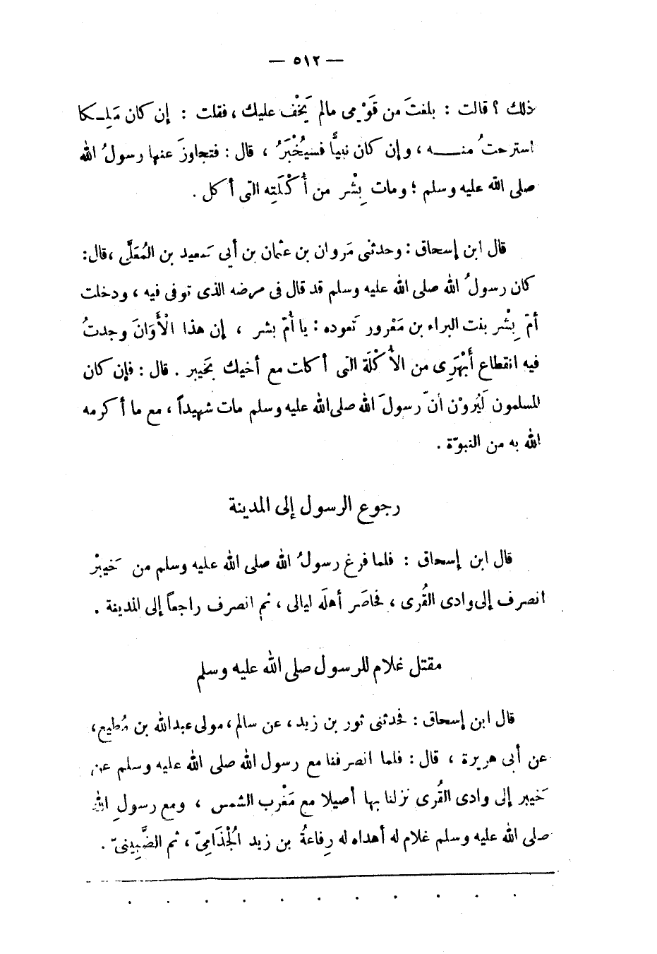 قال ابن إسحاق: فحدثنى ثور بْنُ زَيْدٍ، عَنْ سَالِمٍ، مَوْلَى عَبْدِ اللهِ بْنِ مُطِيعٍ، عَنْ أَبِي هُرَيْرَةَ، قَالَ: فَلَمّا انْصَرَفْنَا مَعَ رَسُولِ اللهِ صَلَّى اللَّهُ عَلَيْهِ وَسَلَّمَ عَنْ خَيْبَرَ إلَى وَادِي الْقُرَى نَزَلْنَا بِهَا أَصِيلًا مَعَ مَغْرِبِ الشّمْسِ، وَمَعَ رَسُولِ اللهِ صَلّى اللهُ عَلَيْهِ وَسَلّمَ غُلَامٌ لَهُ أَهْدَاهُ لَهُ رِفَاعَةُ بْنُ زَيْدٍ الْجُذَامِيّ، ثُمّ الضّبينىّ