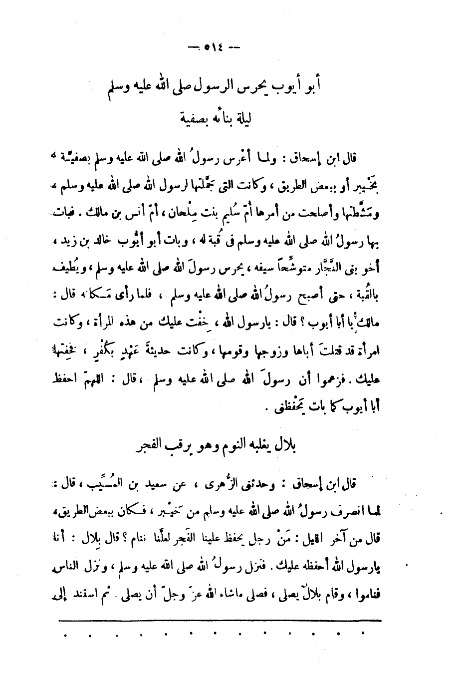 قَالَ ابْنُ إسْحَاقَ: وَلَمّا أَعْرَسَ رَسُولُ اللهِ صَلّى اللهُ عَلَيْهِ وَسَلّمَ بِصَفِيّةَ، بِخَيْبَرِ أَوْ بِبَعْضِ الطّرِيقِ، وَكَانَتْ الّتِي جَمّلَتْهَا لِرَسُولِ اللهِ صلى الله عليه وسلم، ومشّطتها وأصلحت من أَمْرِهَا أُمّ سُلَيْمٍ بِنْتُ مِلْحَانَ، أُمّ أَنَسِ بْنِ مَالِكٍ. فَبَاتَ بِهَا رَسُولُ اللهِ صَلّى اللهُ عَلَيْهِ وَسَلّمَ فِي قُبّةٍ لَهُ، وَبَاتَ أَبُو أَيّوبَ خَالِدُ بْنُ زَيْدٍ، أَخُو بَنِي النّجّارِ مُتَوَشّحًا سَيْفَهُ، يَحْرَسُ رَسُولَ اللهِ صَلّى اللهُ عَلَيْهِ وَسَلّمَ، وَيُطِيفُ بِالْقُبّةِ، حَتّى أَصْبَحَ رسول الله صلى الله عليه وسلم، فلما رأى مكانه قال: