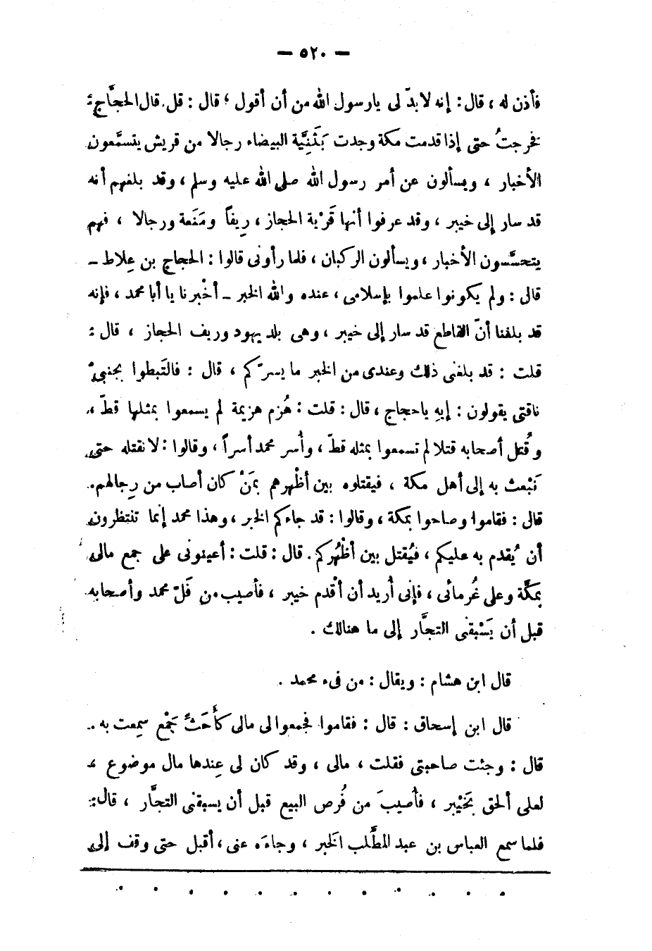 قُلْت: قَدْ بَلَغَنِي ذَلِكَ وَعِنْدِي مِنْ الْخَبَرِ مَا يَسُرّكُمْ، قَالَ: فَالْتَبَطُوا بِجَنْبَيْ نَاقَتِي يَقُولُونَ: إيهِ يَا حَجّاجُ، قَالَ: قلت: هزم هزيمة لم يسمعوا بِمِثْلِهَا قَطّ، وَقُتِلَ أَصْحَابُهُ قَتْلًا لَمْ تَسْمَعُوا بِمِثْلِهِ قَطّ، وَأُسِرَ مُحَمّدٌ أَسْرًا، وَقَالُوا: لَا نَقْتُلُهُ حَتّى نَبْعَثَ بِهِ إلَى أَهْلِ مَكّةَ، فَيَقْتُلُوهُ بَيْنَ أَظْهُرِهِمْ بِمَنْ كَانَ أَصَابَ مِنْ رِجَالِهِمْ.