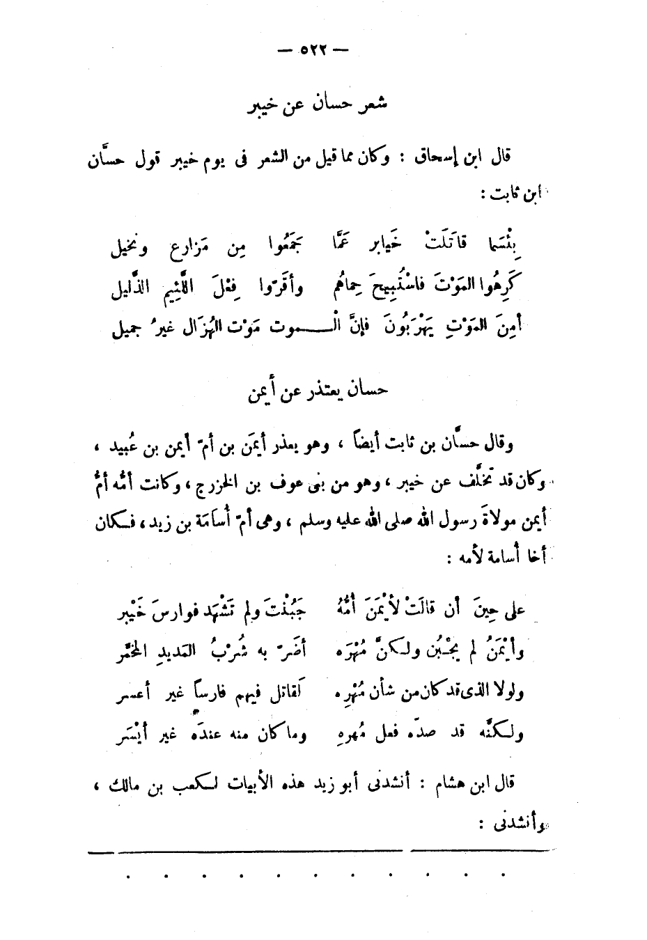 وَقَالَ حَسّانُ بْنُ ثَابِتٍ أَيْضًا، وَهُوَ يَعْذِرُ أَيْمَنَ بْنِ أُمّ أَيْمَنَ بْنِ عُبَيْدٍ، وَكَانَ قَدْ تَخَلّفَ عَنْ خَيْبَرَ، وَهُوَ مِنْ بَنِي عَوْفِ بْنِ الْخَزْرَجِ، وَكَانَتْ أُمّهُ أُمّ أَيْمَنَ مَوْلَاةُ رَسُولِ اللهِ صَلَّى اللَّهُ عَلَيْهِ وَسَلَّمَ، وَهِيَ أُمّ أُسَامَةَ بْنِ زَيْدٍ، فَكَانَ أَخَا أسامة لأمه: