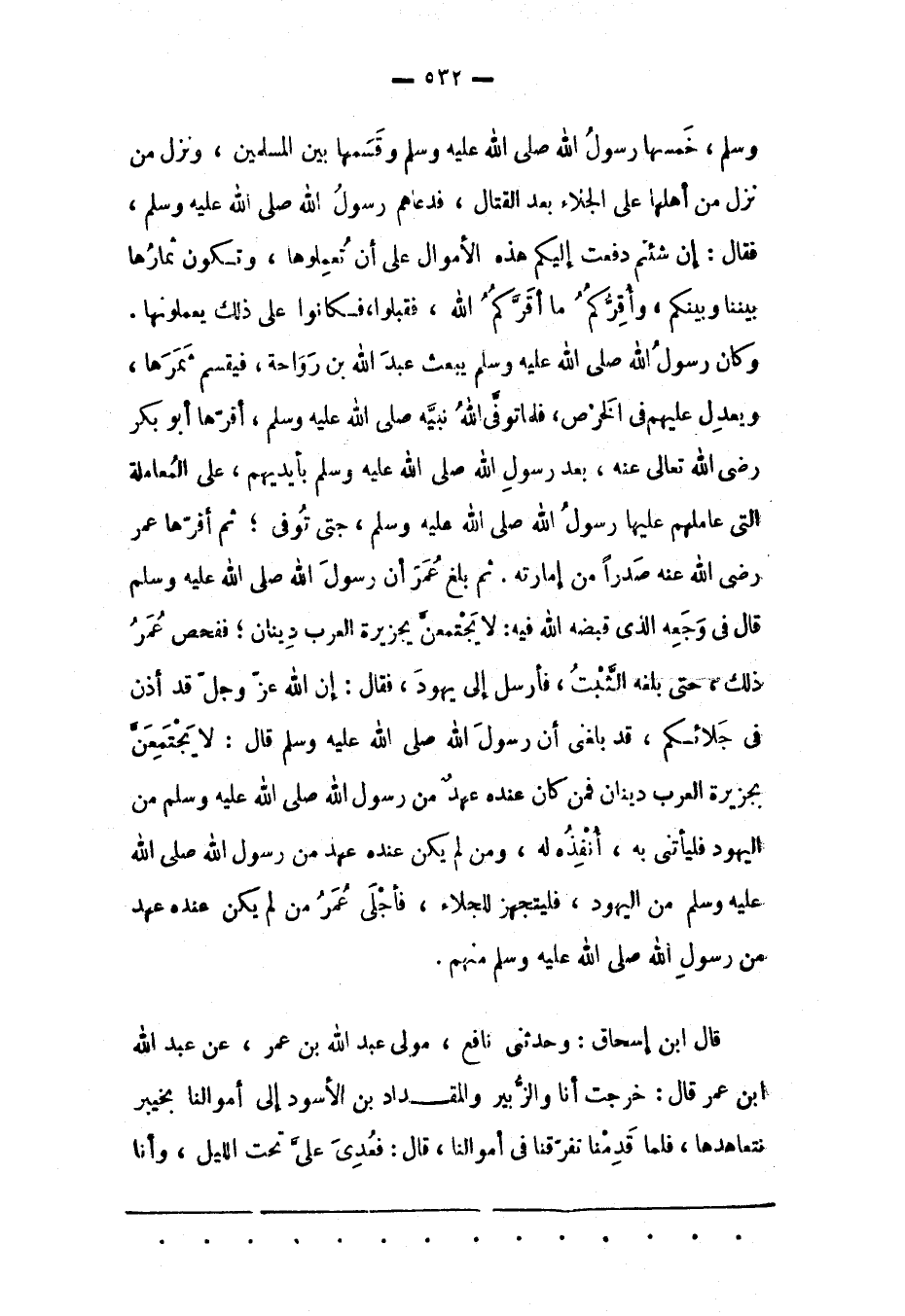 وَكَانَ رَسُولُ اللهِ صَلّى اللهُ عَلَيْهِ وَسَلّمَ يَبْعَثُ عَبْدَ اللهِ بْنَ رَوَاحَةَ، فَيَقْسِمُ ثَمَرَهَا، وَيَعْدِلُ عَلَيْهِمْ فِي الْخَرْصِ، فَلَمّا تَوَفّى اللهُ نَبِيّهُ صَلّى اللهُ عَلَيْهِ وَسَلّمَ، أَقَرّهَا أَبُو بَكْرٍ رَضِيَ اللهُ تَعَالَى عَنْهُ، بَعْدَ رَسُولِ اللهِ صَلَّى اللَّهُ عَلَيْهِ وَسَلَّمَ بِأَيْدِيهِمْ، عَلَى الْمُعَامَلَةِ الّتِي عَامَلَهُمْ عَلَيْهَا رَسُولُ اللهِ صَلّى اللهُ عَلَيْهِ وَسَلّمَ، حَتّى تُوُفّيَ؛ ثُمّ أَقَرّهَا عُمَرُ رَضِيَ اللهُ عَنْهُ صَدْرًا مِنْ إمَارَتِهِ. ثُمّ بَلَغَ عُمَرَ أَنّ رَسُولَ اللهِ صَلَّى اللَّهُ عَلَيْهِ وَسَلّمَ قَالَ فِي وَجَعِهِ الّذِي قَبَضَهُ اللهُ فِيهِ: لَا يَجْتَمِعَنّ بِجَزِيرَةِ الْعَرَبِ دِينَانِ؛ فَفَحَصَ عُمَرُ ذَلِكَ، حَتّى بَلَغَهُ الثّبْتُ، فَأَرْسَلَ إلىَ يَهُودَ، فَقَالَ: إنّ اللهَ عَزّ وَجَلّ قَدْ أَذِنَ فِي جَلَائِكُمْ، قَدْ بَلَغَنِي أَنّ رسول الله صلى الله عليه وسلم قال: لَا يَجْتَمِعَنّ بِجَزِيرَةِ الْعَرَبِ دِينَانِ فَمَنْ كَانَ عِنْدَهُ عَهْدٌ مِنْ رَسُولِ اللهِ صَلَّى اللَّهُ عَلَيْهِ وَسَلَّمَ مِنْ الْيَهُودِ فَلْيَأْتِنِي بِهِ، أُنْفِذُهُ له، ومن لَمْ يَكُنْ عِنْدَهُ عَهْدٌ مِنْ رَسُولِ اللهِ صَلَّى اللَّهُ عَلَيْهِ وَسَلَّمَ مِنْ الْيَهُودِ، فَلْيَتَجَهّزْ لِلْجَلَاءِ، فَأَجْلَى عُمَرُ مَنْ لَمْ يَكُنْ عِنْدَهُ عَهْدٌ مِنْ رَسُولِ اللهِ صَلَّى اللَّهُ عَلَيْهِ وَسَلَّمَ مِنْهُمْ.