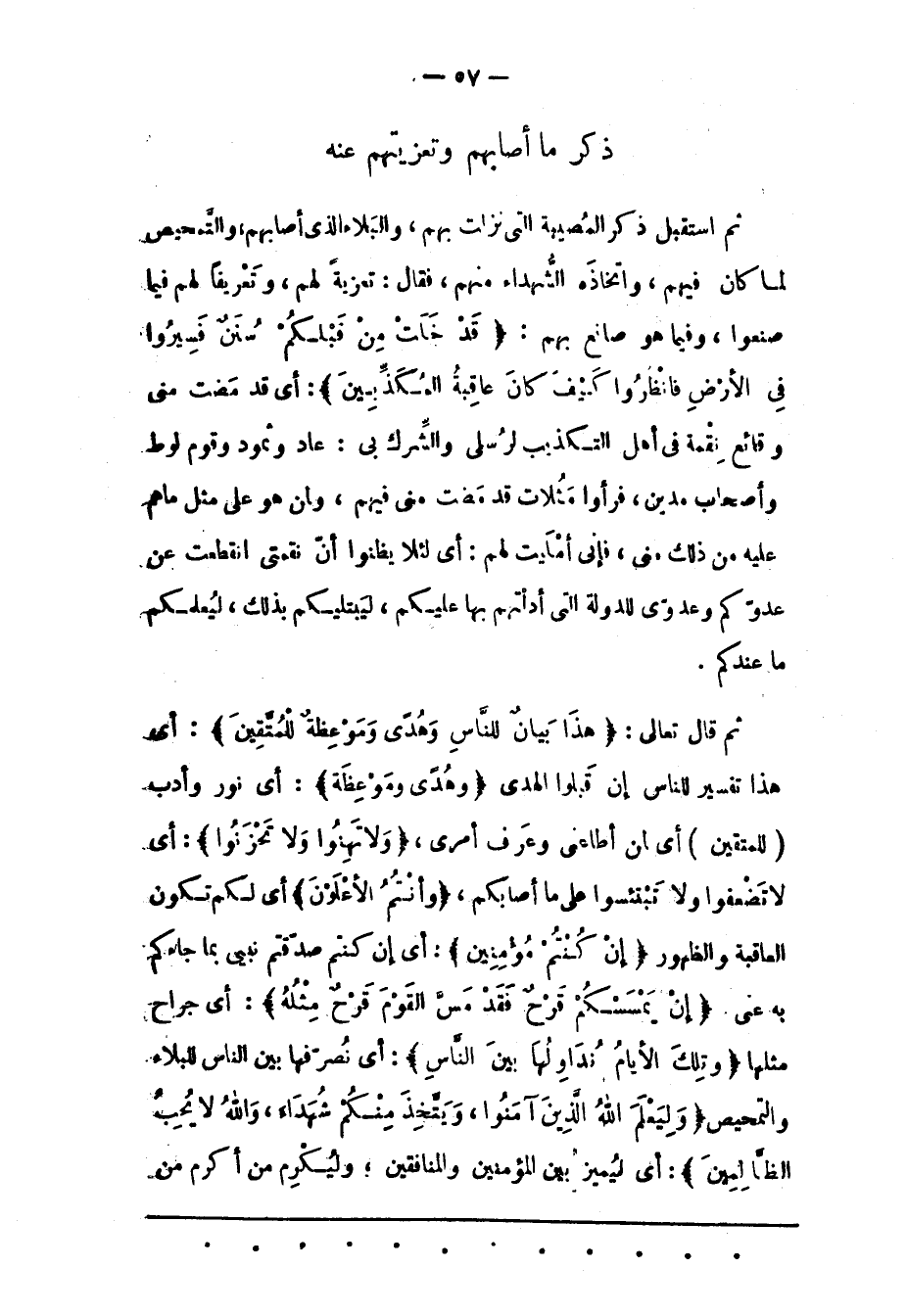 ثُمّ قَالَ تَعَالَى: هَذَا بَيانٌ لِلنَّاسِ وَهُدىً وَمَوْعِظَةٌ لِلْمُتَّقِينَ: أَيْ هَذَا تَفْسِيرٌ لِلنّاسِ إنْ قَبِلُوا الْهُدَى وَهُدىً وَمَوْعِظَةٌ: أَيْ نُورٌ وَأَدَبٌ (لِلْمُتّقِينَ) أَيْ لِمَنْ أَطَاعَنِي وَعَرَفَ أَمْرِي، وَلا تَهِنُوا وَلا تَحْزَنُوا: أَيْ لَا تَضْعُفُوا وَلَا تَبْتَئِسُوا عَلَى مَا أَصَابَكُمْ، وَأَنْتُمُ الْأَعْلَوْنَ أَيْ لَكُمْ تَكُونُ الْعَاقِبَةُ وَالظّهُورُ إِنْ كُنْتُمْ مُؤْمِنِينَ: أَيْ إنْ كُنْتُمْ صَدّقْتُمْ نَبِيّي بِمَا جَاءَكُمْ بِهِ عَنّي إِنْ يَمْسَسْكُمْ قَرْحٌ فَقَدْ مَسَّ الْقَوْمَ قَرْحٌ مِثْلُهُ: أَيْ جِرَاحُ مِثْلُهَا وَتِلْكَ الْأَيَّامُ نُداوِلُها بَيْنَ النَّاسِ: أَيْ نُصَرّفُهَا بَيْنَ النّاسِ لِلْبَلَاءِ وَالتّمْحِيصِ وَلِيَعْلَمَ اللَّهُ الَّذِينَ آمَنُوا، وَيَتَّخِذَ مِنْكُمْ شُهَداءَ، وَاللَّهُ لَا يُحِبُّ الظَّالِمِينَ: أَيْ لِيُمَيّزَ بَيْنَ الْمُؤْمِنِينَ وَالْمُنَافِقِينَ؛ وَلِيُكْرِمَ مَنْ أَكْرَمَ من