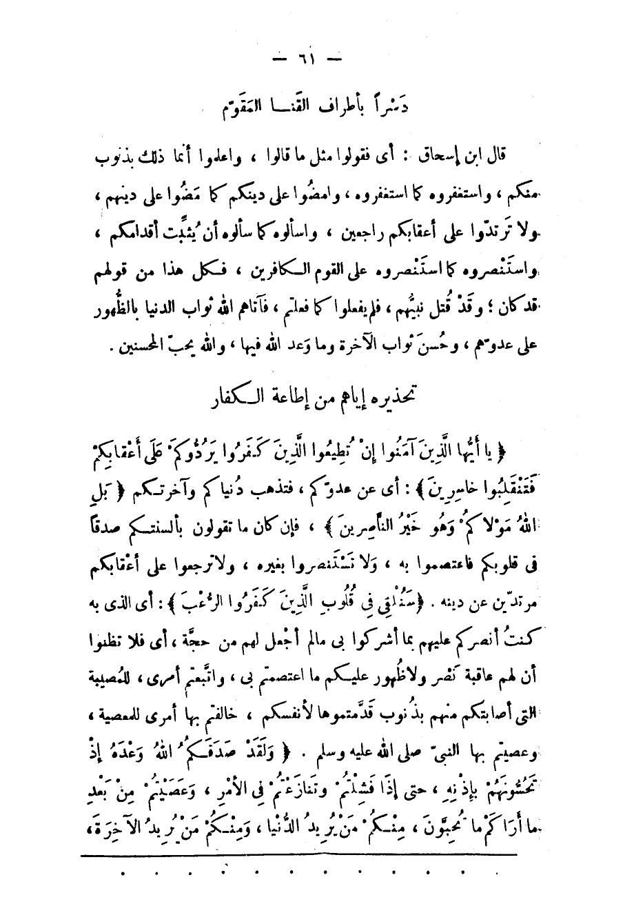 قَالَ ابْنُ إسْحَاقَ: أَيْ فَقُولُوا مِثْلَ مَا قَالُوا، وَاعْلَمُوا أَنّمَا ذَلِكَ بِذُنُوبِ مِنْكُمْ، وَاسْتَغْفِرُوهُ كَمَا اسْتَغْفَرُوهُ، وَامْضُوا عَلَى دِينِكُمْ كَمَا مَضَوْا عَلَى دِينِهِمْ، وَلَا تَرْتَدّوا عَلَى أَعْقَابِكُمْ رَاجِعِينَ، وَاسْأَلُوهُ كَمَا سَأَلُوهُ أَنْ يُثَبّتَ أَقْدَامَكُمْ، وَاسْتَنْصِرُوهُ كَمَا اسْتَنْصَرُوهُ عَلَى الْقَوْمِ الْكَافِرِينَ، فَكُلّ هَذَا مِنْ قَوْلِهِمْ قَدْ كَانَ؛ وَقَدْ قُتِلَ نَبِيّهُمْ، فَلَمْ يَفْعَلُوا كَمَا فَعَلْتُمْ، فَآتَاهُمُ اللهُ ثَوَابَ الدّنْيَا بِالظّهُورِ عَلَى عَدُوّهِمْ، وَحُسْنَ ثَوَابِ الْآخِرَةِ وَمَا وَعَدَ اللهُ فِيهَا، وَاللهُ يُحِبّ الْمُحْسِنِينَ.