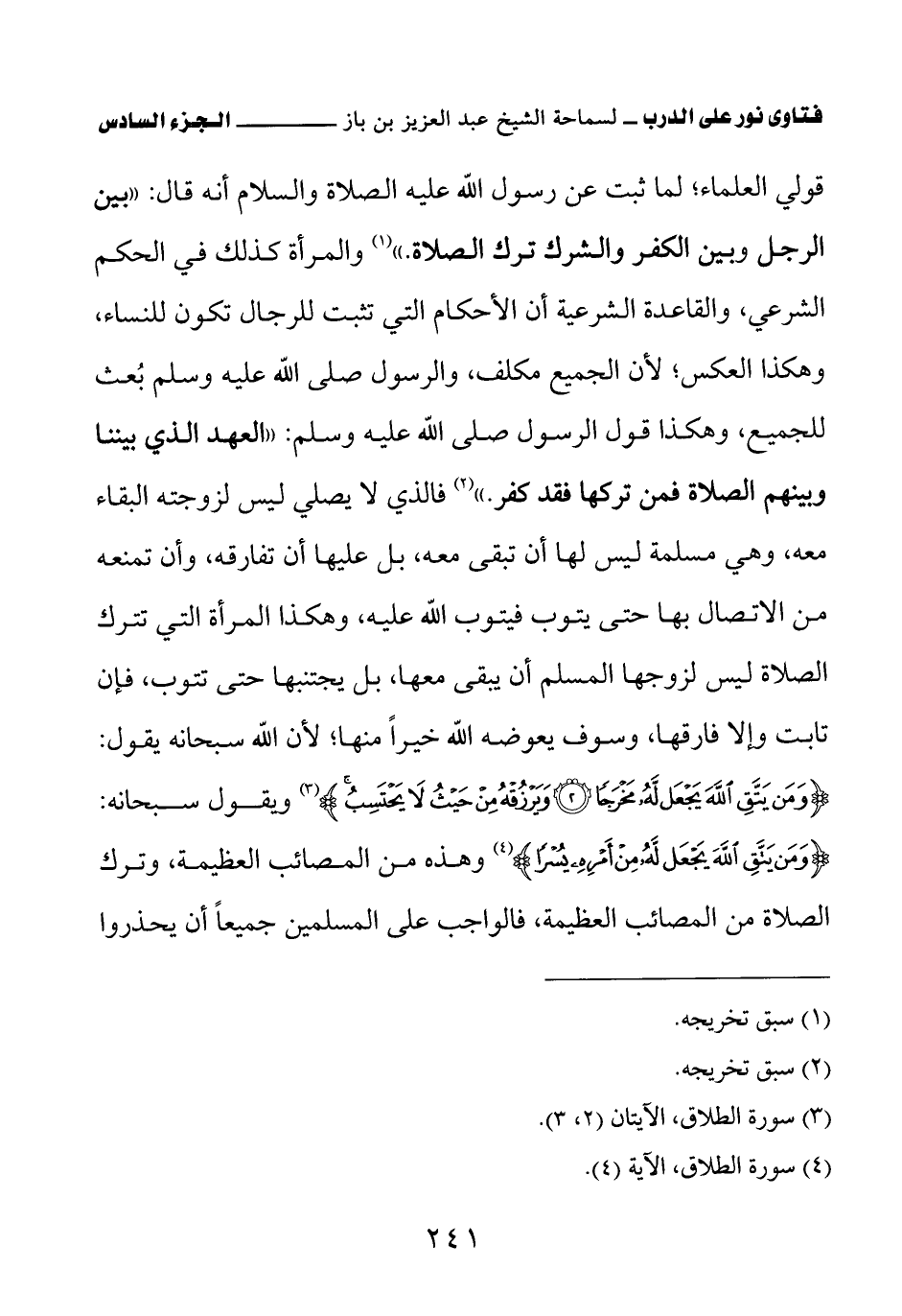قولي العلماء؛ لما ثبت عن رسول الله عليه الصلاة والسلام أنه قال: «بين الرجل وبين الكفر والشرك ترك الصلاة (¬1)» والمرأة كذلك في الحكم الشرعي والقاعدة الشرعية أن الأحكام التي تثبت للرجال تكون للنساء، وهكذا العكس؛ لأن الجميع مكلف، والرسول صلى الله عليه وسلم بعث للجميع، وهكذا قول الرسول صلى الله عليه وسلم: «العهد الذي بيننا وبينهم الصلاة، فمن تركها فقد كفر (¬2)» فالذي لا يصلي ليس لزوجته البقاء معه، وهي مسلمة ليس لها أن تبقى معه، بل عليها أن تفارقه، وأن تمنعه من الاتصال بها حتى يتوب فيتوب الله عليه وهكذا المرأة التي تترك الصلاة ليس لزوجها المسلم أن يبقى معها، بل يجتنبها حتى تتوب، فإن تابت وإلا فارقها وسوف يعوضه الله خيرا منها؛ لأن الله سبحانه يقول: {وَمَنْ يَتَّقِ اللَّهَ يَجْعَلْ لَهُ مَخْرَجًا} (¬3) {وَيَرْزُقْهُ مِنْ حَيْثُ لَا يَحْتَسِبُ} (¬4) ويقول سبحانه: {وَمَنْ يَتَّقِ اللَّهَ يَجْعَلْ لَهُ مِنْ أَمْرِهِ يُسْرًا} (¬5) وهذه من المصائب العظيمة وترك الصلاة من المصائب العظيمة، فالواجب على المسلمين جميعا أن يحذروا