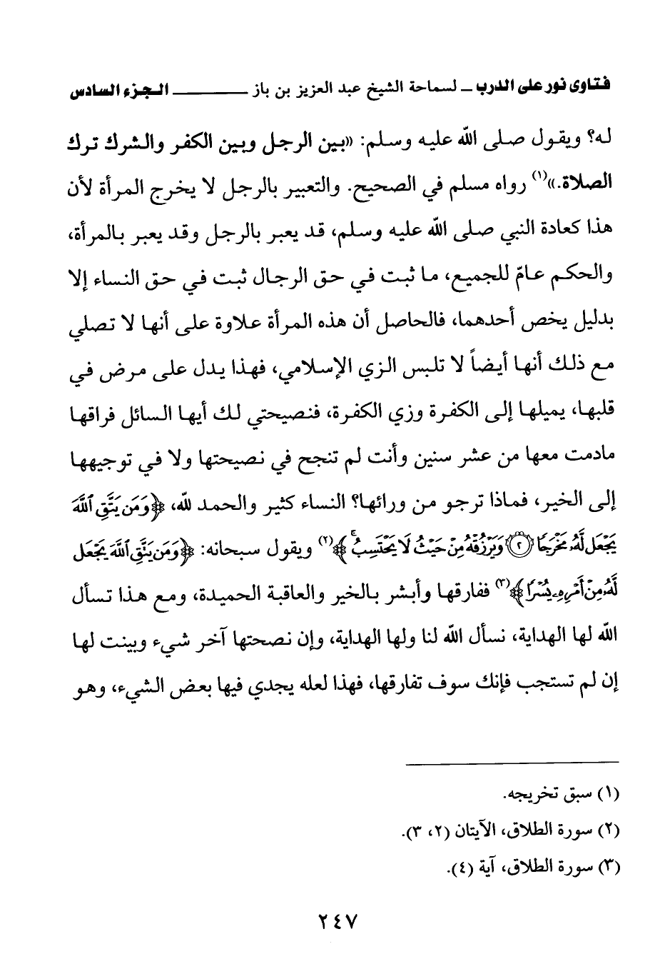 والتعبير بالرجل لا يخرج المرأة لأن هذا كعادة النبي صلى الله عليه وسلم، قد يعبر بالرجل وقد يعبر بالمرأة، والحكم عام للجميع، ما ثبت في حق الرجال ثبت في حق النساء إلا بدليل يخص أحدهما، فالحاصل أن هذه المرأة علاوة على أنها لا تصلي مع ذلك أنها أيضا لا تلبس الزي الإسلامي فهذا يدل على مرض في قلبها يميلها إلى الكفرة وزي الكفرة، فنصيحتي لك أيها السائل فراقها ما دمت معها من عشر سنين وأنت لم تنجح في توجيهها إلى الخير، فماذا ترجو من ورائها؟ النساء كثير والحمد لله {وَمَنْ يَتَّقِ اللَّهَ يَجْعَلْ لَهُ مَخْرَجًا} (¬2) {وَيَرْزُقْهُ مِنْ حَيْثُ لَا يَحْتَسِبُ} (¬3) ويقول سبحانه: {وَمَنْ يَتَّقِ اللَّهَ يَجْعَلْ لَهُ مِنْ أَمْرِهِ يُسْرًا} (¬4) ففارقها وأبشر بالخير والعاقبة الحميدة، ومع هذا تسأل الله لها الهداية، نسأل الله لنا ولها الهداية، وإن نصحتها آخر شيء وبينت لها إن لم تستجب فإنك سوف تفارقها، فهذا لعله يجدي فيها بعض الشيء، وهو