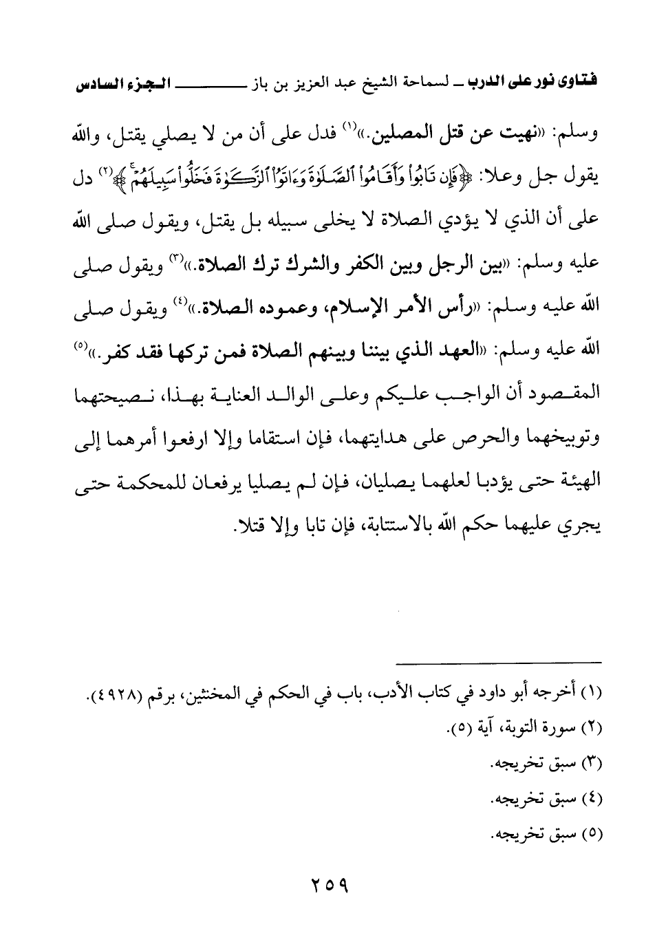 (¬5) أخرجه الترمذي في كتاب الإيمان عن رسول الله صلى الله عليه وسلم، باب ما جاء في ترك الصلاة، برقم (2621)، والنسائي في المجتبى في كتاب الصلاة، باب الحكم في تارك الصلاة، برقم (463)، وابن ماجه في كتاب إقامة الصلاة والسنة فيها، باب ما جاء فيمن ترك الصلاة، برقم (1079).