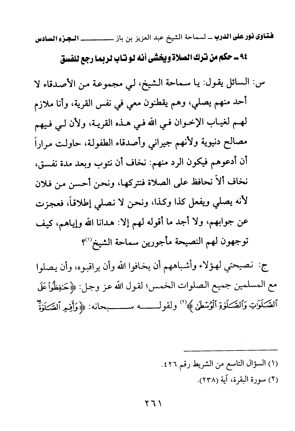 ج: نصيحتي لهؤلاء وأشباههم أن يخافوا الله وأن يراقبوه، وأن يصلوا مع المسلمين جميع الصلوات الخمس؛ لقول الله عز وجل: {حَافِظُوا عَلَى الصَّلَوَاتِ وَالصَّلَاةِ الْوُسْطَى} (¬2) ولقوله سبحانه: