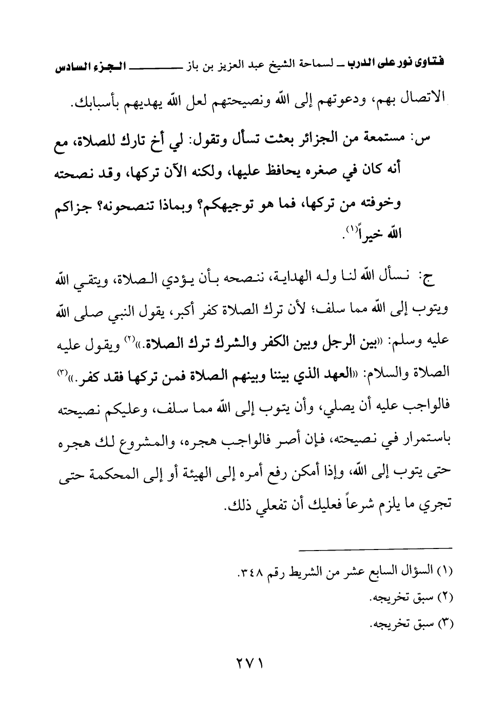 (¬3) أخرجه الترمذي في كتاب الإيمان عن رسول الله صلى الله عليه وسلم، باب ما جاء في ترك الصلاة، برقم (2621)، والنسائي في المجتبى في كتاب الصلاة، باب الحكم في تارك الصلاة، برقم (463)، وابن ماجه في كتاب إقامة الصلاة والسنة فيها، باب ما جاء فيمن ترك الصلاة، برقم (1079).