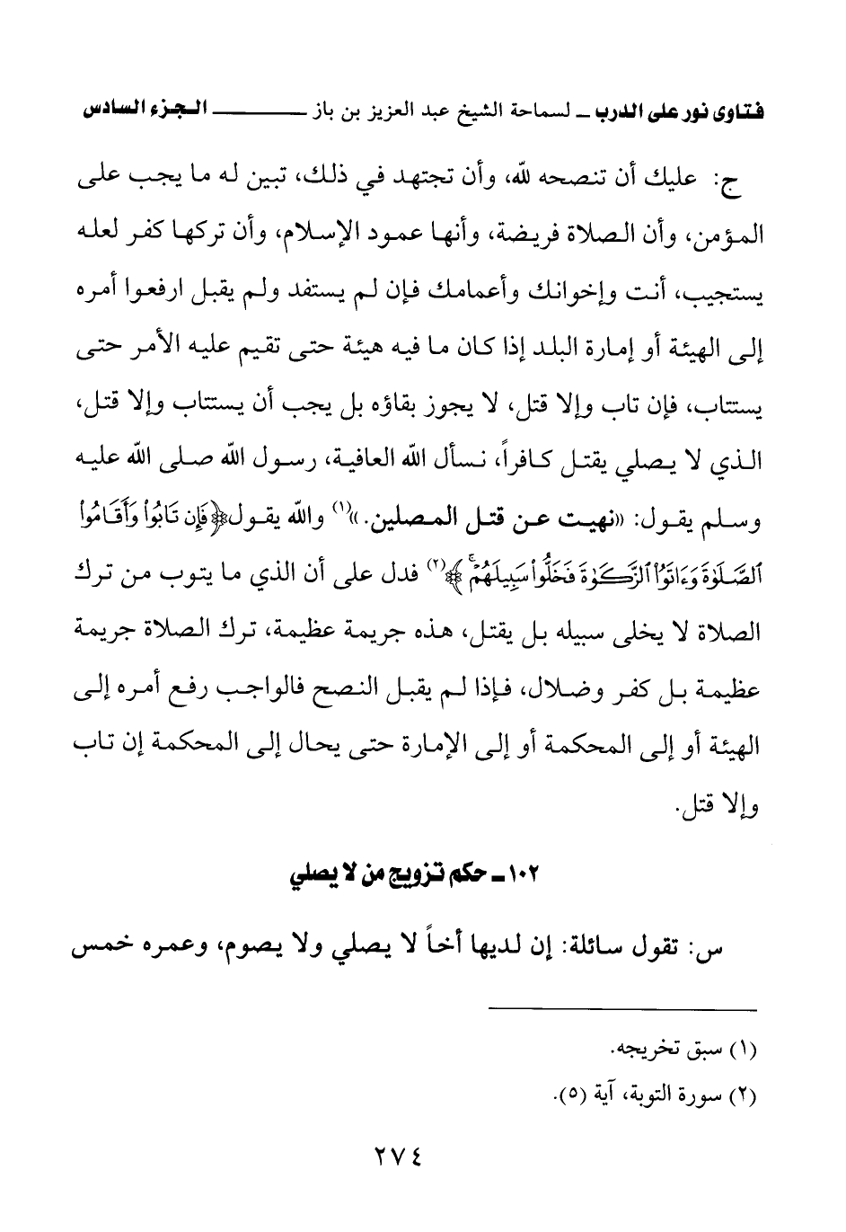 ج: عليك أن تنصحه لله، وأن تجتهد في ذلك، تبين له ما يجب على المؤمن، وأن الصلاة فريضة، وأنها عمود الإسلام وأن تركها كفر لعله يستجيب، أنت وإخوانك وأعمامك فإن لم يستفد ولم يقبل ارفعوا أمره إلى الهيئة أو إمارة البلد إذا كان ما فيه هيئة حتى تقيم عليه الأمر حتى يستتاب، فإن تاب وإلا قتل، لا يجوز بقاؤه بل يجب أن يستتاب وإلا قتل، الذي لا يصلي يقتل كافرا نسأل الله العافية رسول الله صلى الله عليه وسلم يقول: «نهيت عن قتل المصلين (¬1)» والله يقول: {فَإِنْ تَابُوا وَأَقَامُوا الصَّلَاةَ وَآتَوُا الزَّكَاةَ فَخَلُّوا سَبِيلَهُمْ} (¬2) فدل على أن الذي ما يتوب من ترك الصلاة لا يخلى سبيله بل يقتل، هذه جريمة عظيمة، ترك الصلاة جريمة عظيمة بل كفر وضلال، فإذا لم يقبل النصح فالواجب رفع أمره إلى الهيئة أو إلى المحكمة أو إلى الإمارة حتى يحال إلى المحكمة إن تاب وإلا قتل.