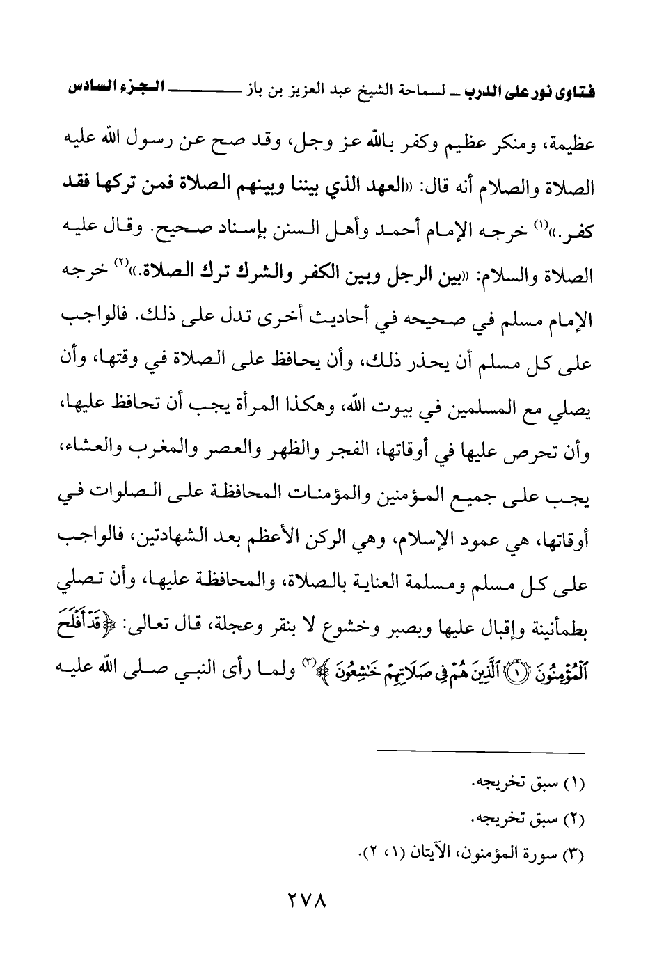 فالواجب على كل مسلم أن يحذر ذلك، وأن يحافظ على الصلاة في وقتها وأن يصلي مع المسلمين في بيوت الله وهكذا المرأة يجب أن تحافظ عليها وأن تحرص عليها في أوقاتها، الفجر والظهر والعصر والمغرب والعشاء، يجب على جميع المؤمنين والمؤمنات المحافظة على الصلوات في أوقاتها، هي عمود الإسلام، وهي الركن الأعظم بعد الشهادتين، فالواجب على كل مسلم ومسلمة العناية بالصلاة، والمحافظة عليها وأن تصلي بطمأنينة وإقبال عليها وبصبر وخشوع لا بنقر وعجلة، قال تعالى: {قَدْ أَفْلَحَ الْمُؤْمِنُونَ} (¬3) {الَّذِينَ هُمْ فِي صَلَاتِهِمْ خَاشِعُونَ} (¬4) ولما رأى النبي صلى الله عليه
