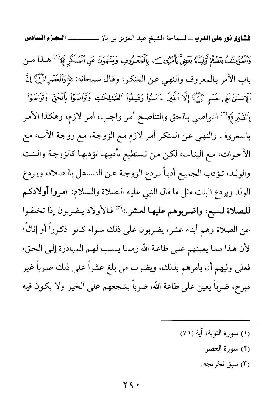 {وَالْمُؤْمِنُونَ وَالْمُؤْمِنَاتُ بَعْضُهُمْ أَوْلِيَاءُ بَعْضٍ يَأْمُرُونَ بِالْمَعْرُوفِ وَيَنْهَوْنَ عَنِ الْمُنْكَرِ} (¬1) هذا من باب الأمر بالمعروف والنهي عن المنكر، وقال سبحانه: {وَالْعَصْرِ} (¬2) {إِنَّ الْإِنْسَانَ لَفِي خُسْرٍ} (¬3) {إِلَّا الَّذِينَ آمَنُوا وَعَمِلُوا الصَّالِحَاتِ} (¬4) {وَتَوَاصَوْا بِالْحَقِّ وَتَوَاصَوْا بِالصَّبْرِ} (¬5) التواصي بالحق والتناصح أمر واجب، أمر لازم، وهكذا الأمر بالمعروف والنهي عن المنكر أمر لازم مع الزوجة، مع زوجة الأب، مع الأخوات، مع البنات لكن من تستطيع تأديبها تؤدبها كالزوجة والبنت والولد تؤدب الجميع أدبا يردع الزوجة عن التساهل بالصلاة، ويردع الولد ويردع البنت مثل ما قال النبي عليه الصلاة والسلام: «مروا أولادكم للصلاة لسبع، واضربوهم عليها لعشر (¬6)» فالأولاد يضربون إذا تخلفوا عن الصلاة وهم أبناء عشر، يضربون على ذلك سواء كانوا ذكورا أو إناثا؛ لأن هذا مما يعينهم على طاعة الله ومما يسبب لهم المبادرة إلى الحق، فعلى وليهم أن يأمرهم بذلك ويضرب من بلغ عشرا على ذلك ضربا غير مبرح ضربا يعين على طاعة الله ضربا يشجعهم على الخير ولا يكون فيه