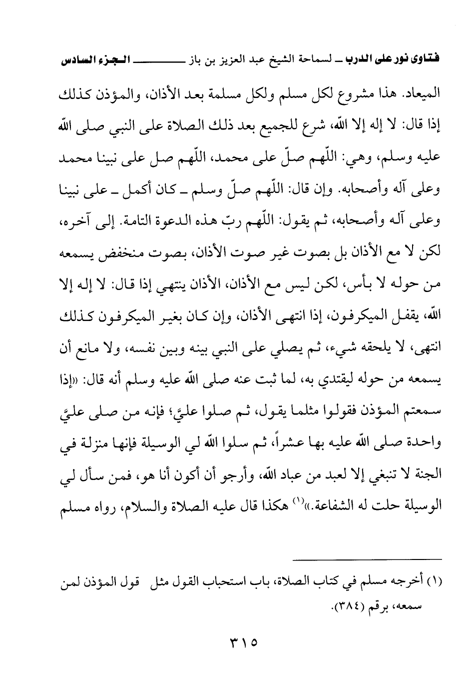 هذا مشروع لكل مسلم ولكل مسلمة بعد الأذان، والمؤذن كذلك إذا قال: لا إله إلا الله، شرع للجميع بعد ذلك الصلاة على النبي صلى الله عليه وسلم وهي: اللهم صل على محمد، اللهم صل على نبينا محمد وعلى آله وأصحابه. وإن قال: اللهم صل وسلم - كان أكمل - على نبينا وعلى آله وأصحابه، ثم يقول: اللهم رب هذه الدعوة التامة. إلى آخره، لكن لا مع الأذان بل بصوت غير صوت الأذان، بصوت منخفض يسمعه من حوله لا بأس لكن ليس مع الأذان، الأذان ينتهي إذا قال: لا إله إلا الله، يقفل الميكرفون، إذا انتهى الأذان وإن كان بغير الميكرفون كذلك انتهى لا يلحقه شيء ثم يصلي على النبي بينه وبين نفسه، ولا مانع أن يسمعه من حوله ليقتدي به، لما ثبت عنه صلى الله عليه وسلم أنه قال: «إذا سمعتم المؤذن فقولوا مثل ما يقول ثم صلوا علي؛ فإنه من صلى علي واحدة صلى الله عليه بها عشرا، ثم سلوا الله لي الوسيلة فإنها منزلة في الجنة لا تنبغي إلا لعبد من عباد الله، وأرجو أن أكون أنا هو فمن سأل لي الوسيلة حلت له الشفاعة (¬1)» هكذا قال عليه الصلاة والسلام، رواه مسلم